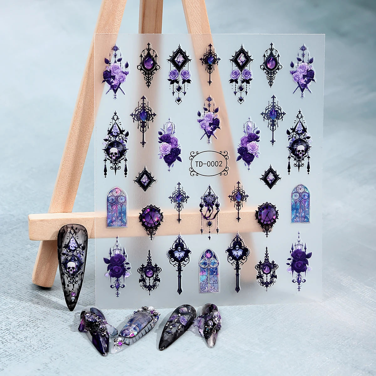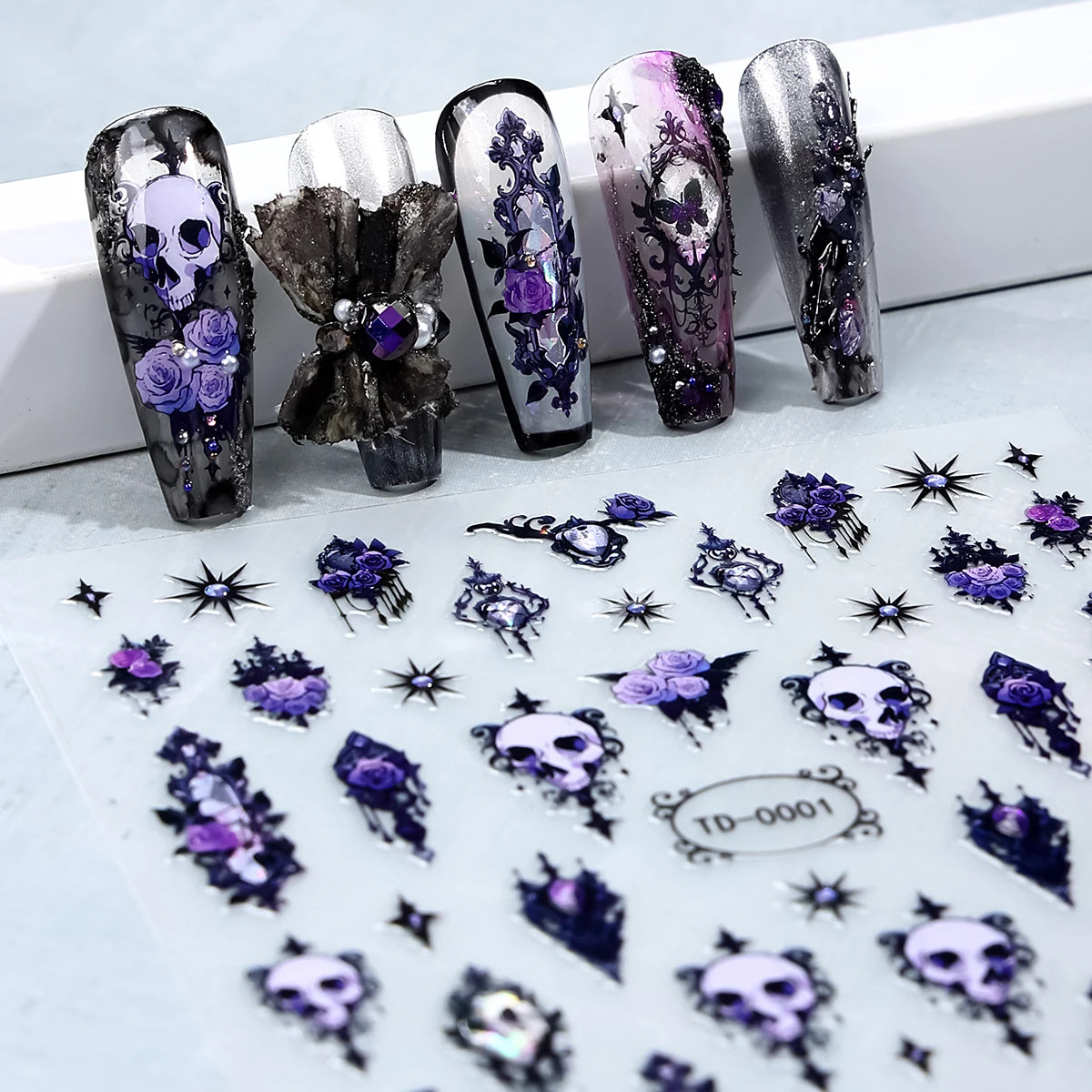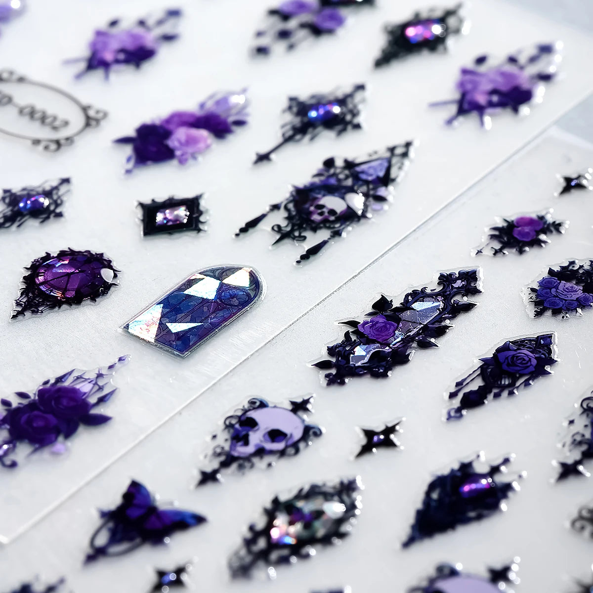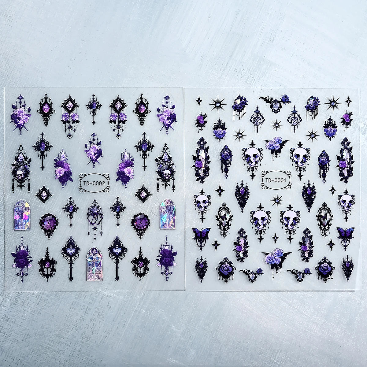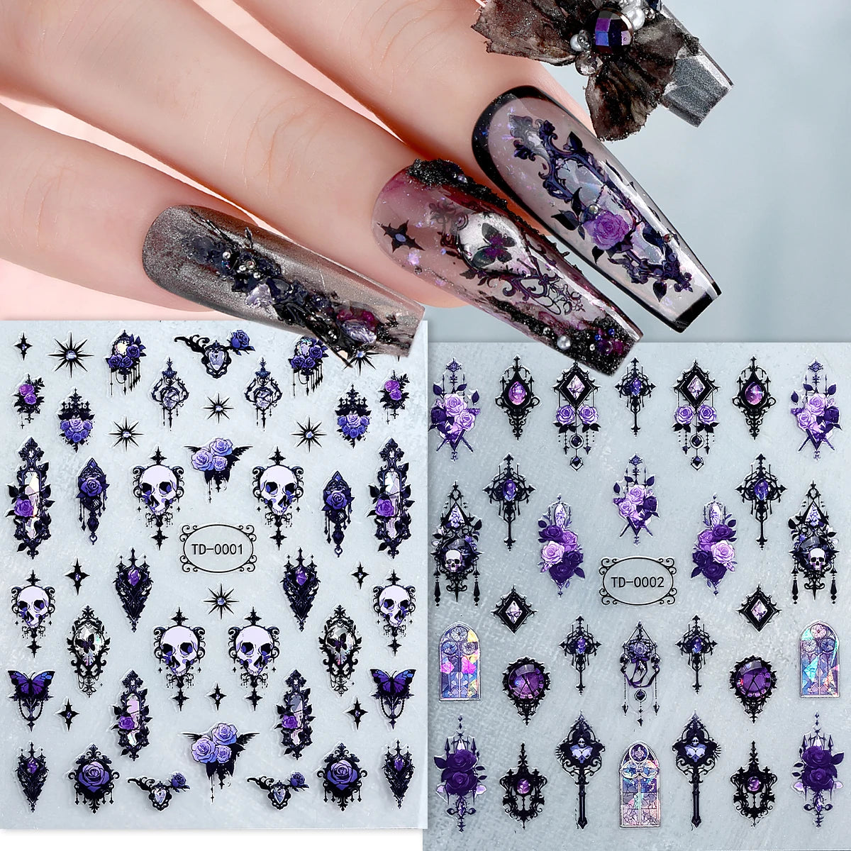 2er Set Gothic Nagelsticker 3D Schwarz Lila Totenkopf Rose