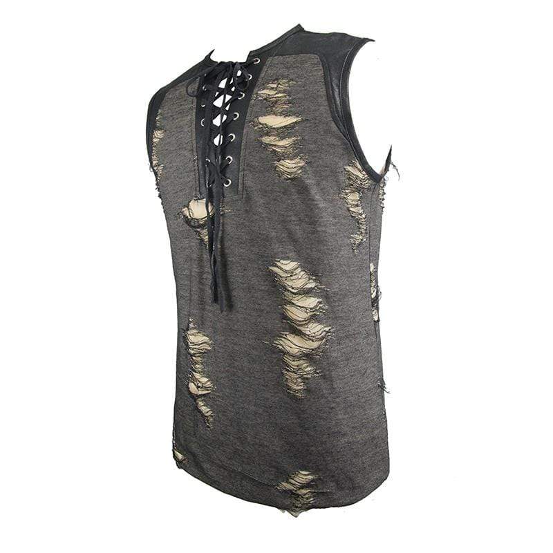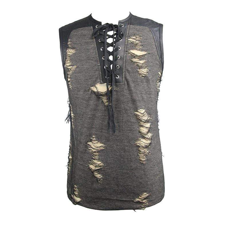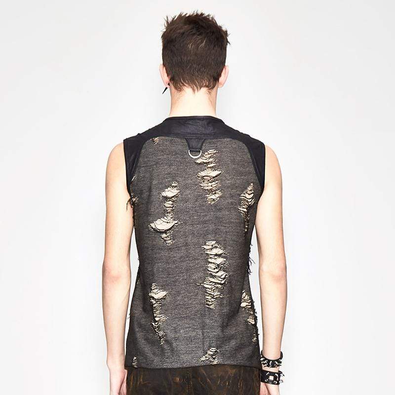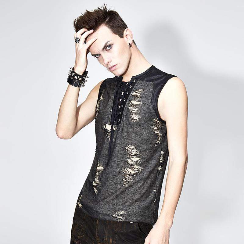 Entdecken Sie unser Ärmelloses Grunge-Oberteil für Herren, die perfekte Ergänzung für Ihren alternativen Kleiderschrank! Dieses einzigartige Kleidungsstück vereint distressed Stoff und Kunstleder, um einen rebellischen Punk-Grunge-Look zu kreieren. Mit seiner vorderen Schnürung verleiht es Ihrem Outfit eine unvergleichlich starke Ästhetik. Perfekt für unterschiedliche Anlässe und ein Muss für alle, die sich von der Masse abheben möchten.