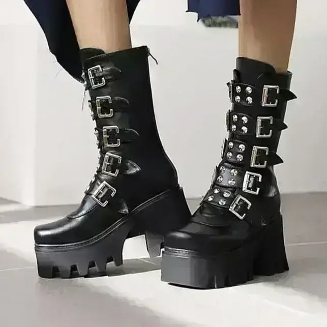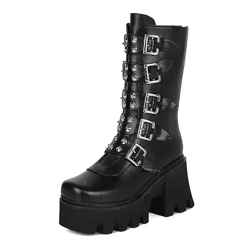 - Stylische Details: Die fünf Doppelschnallenriemen und die spitzen Nieten auf der Vorderseite verleihen diesen Gothic Punk Stiefeln eine unverwechselbare Ästhetik.