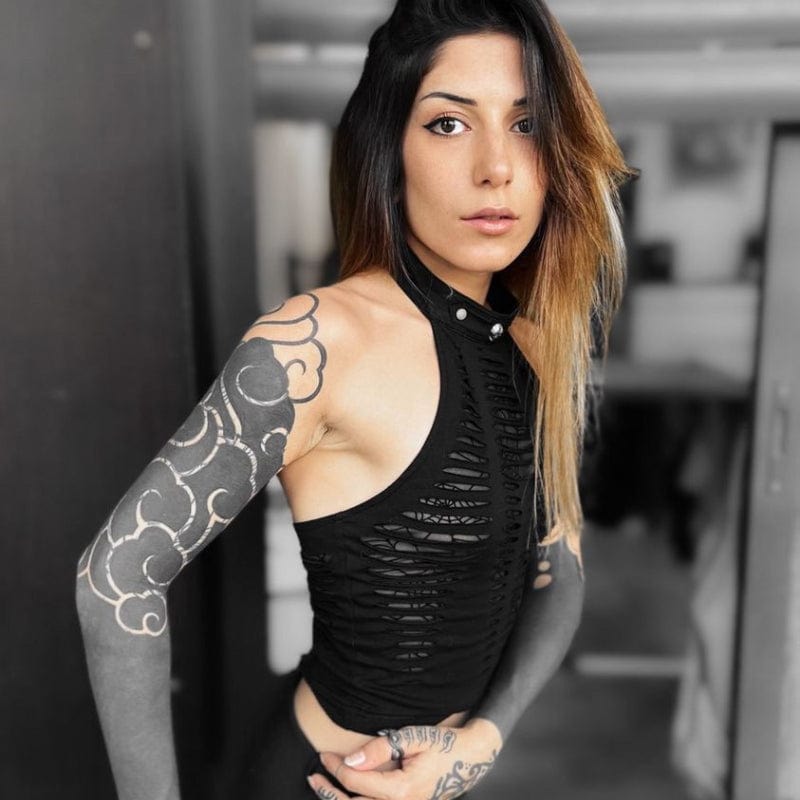 Kombinieren Sie dieses Damen-Crop-Top mit zerrissenem Totenkopf im Grunge-Stil mit einer Gothic-Style-Oberteil oder einer Gothic Crop Tops, um Ihren Look zu vervollständigen. Ergänzen Sie Ihren individuellen Style mit unseren Gothic Oberteilen für Frauen.