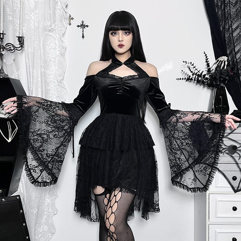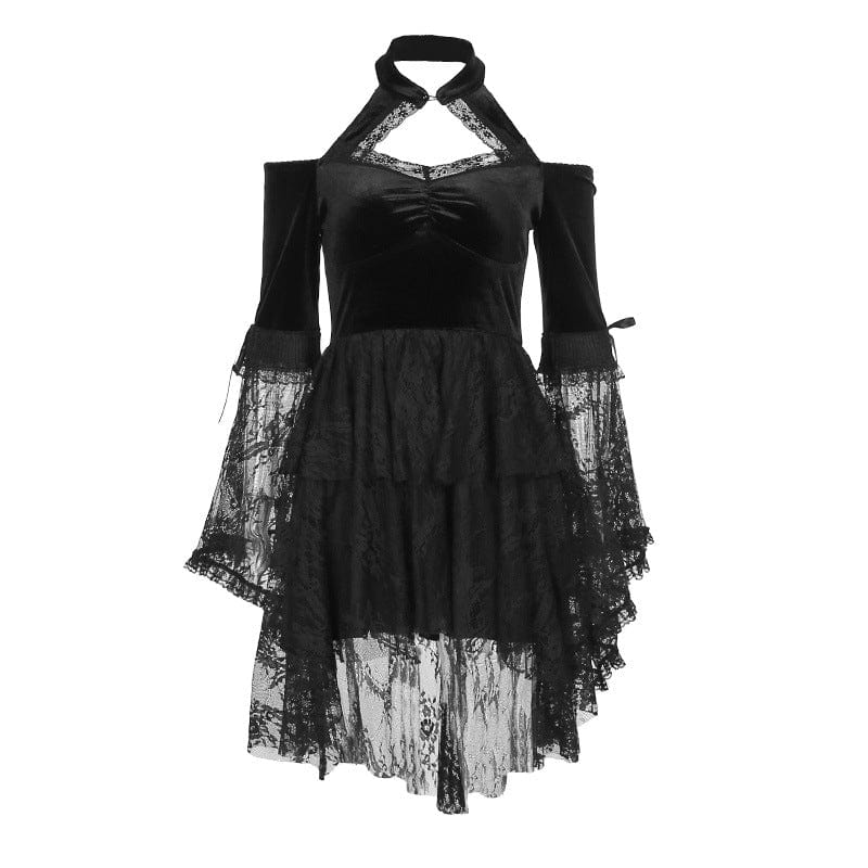 Verpassen Sie nicht die Gelegenheit, mit diesem Damen-Gothic-Kleid aus Spitzensamt mit Trompetenärmeln in Ihrem Kleiderschrank einen echten Blickfang zu haben. Perfekt für den Herbst oder Winter – holen Sie sich dieses Meisterwerk des Gothic-Stils jetzt!