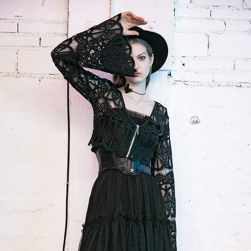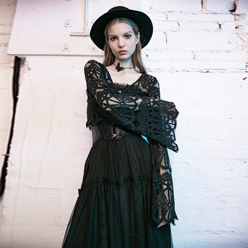 Kombinieren Sie dieses Damen-Oberteile mit ausgestellten Ärmeln und Reißverschluss, Blumenmuster und voller Spitze mit unseren Gothic Tops oder einer Gothic Oberteil Damen, um Ihren individuellen Goth-Stil hervorzuheben. Ergänzen Sie Ihr Outfit mit einer passenden Hose aus der Kategorie Gothic Shirt Damen.