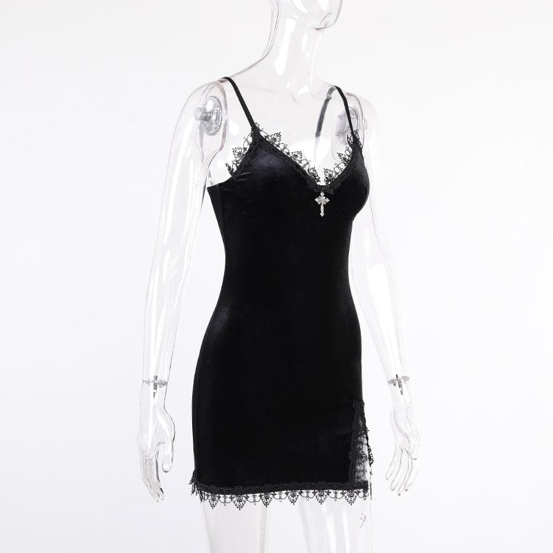 Damen-Slipkleid aus Samt mit tiefem Ausschnitt und Spitze im Gothic-Stil