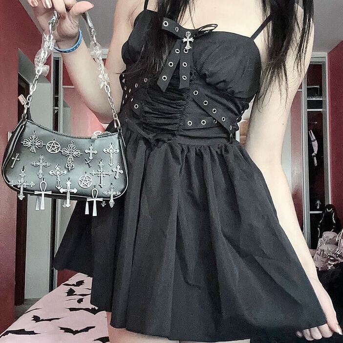 Entdecke unser Damen-Slipkleid im Gothic-Stil mit eleganter Schnürung und markanten Ösen – perfekt für einen auffälligen, stilvollen Look!