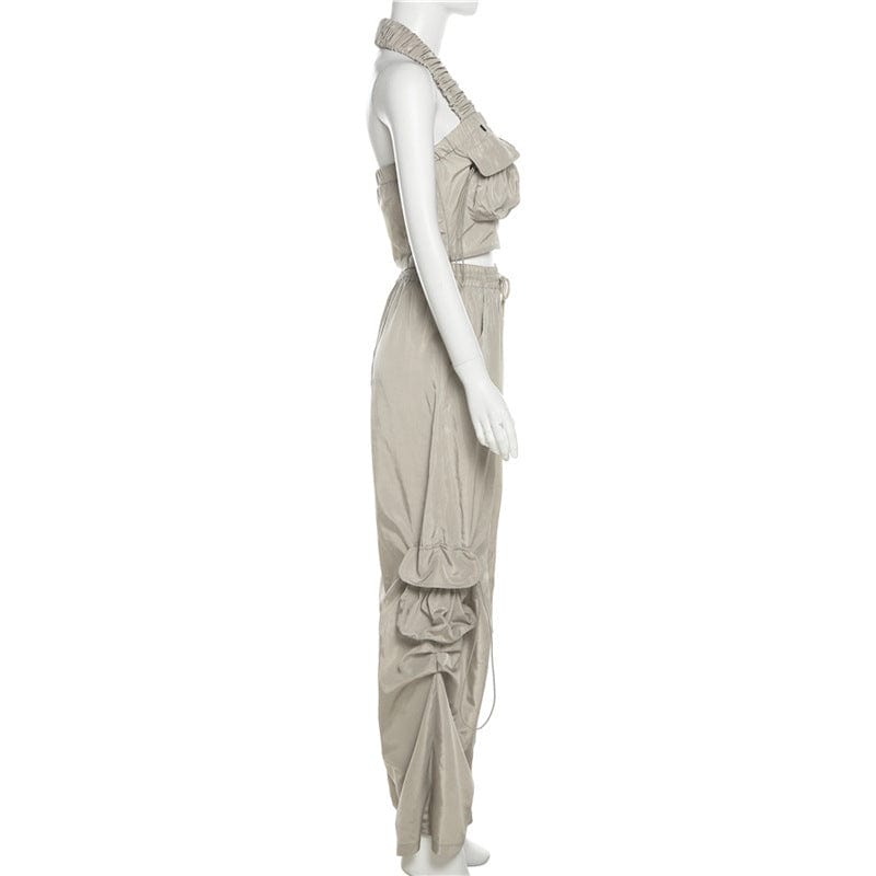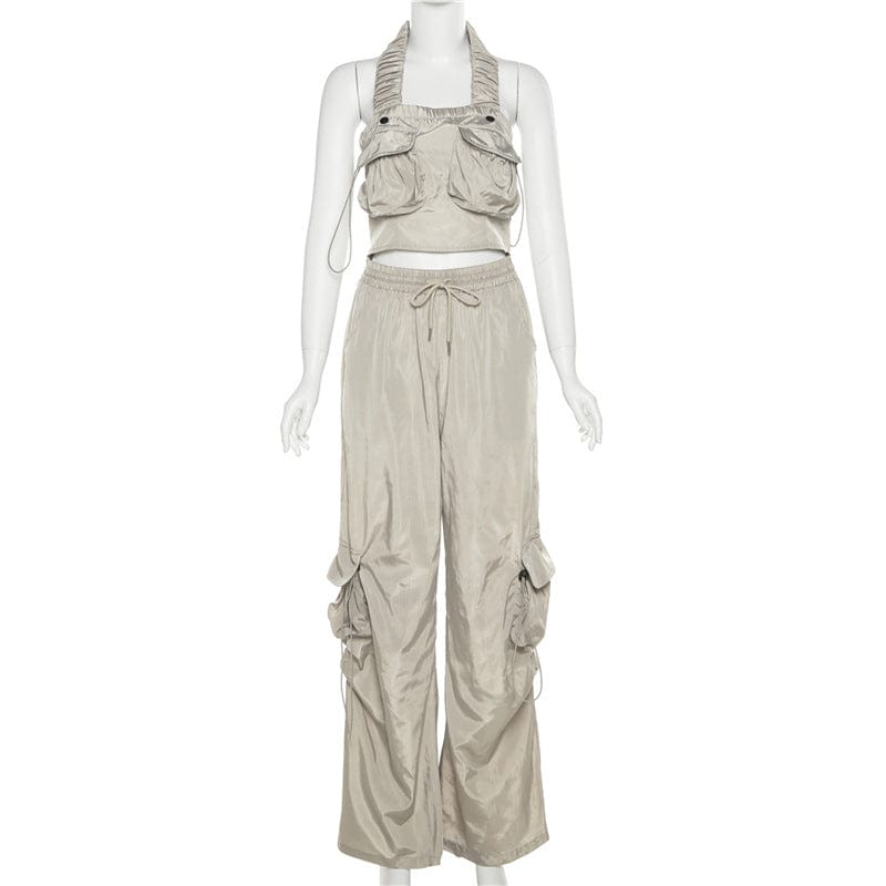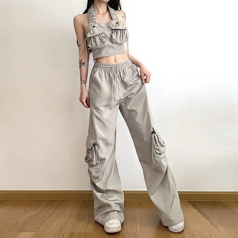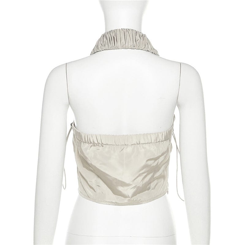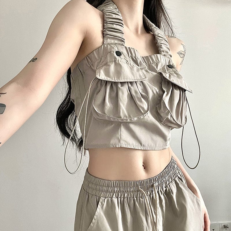 Entdecke das Damen-Tanktop im Grunge-Stil: mit großen Taschen, stylischem Kordelzug und trendigem Neckholder – perfekt für einen lässigen Look!