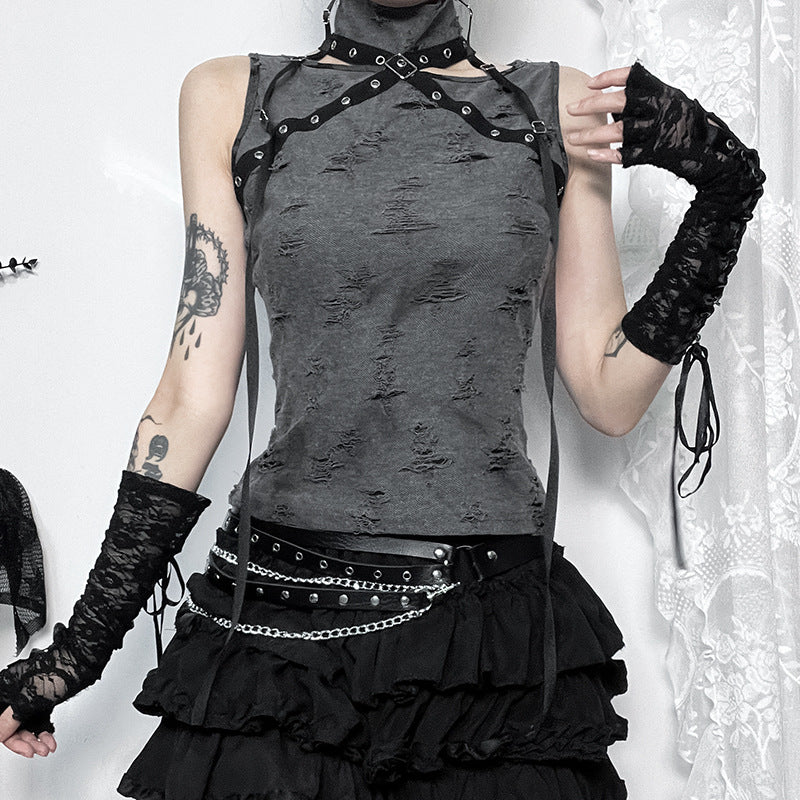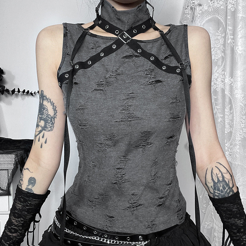 Verleihen Sie Ihrem Outfit das gewisse Etwas mit diesem Damen-Tanktop mit zerrissenen Ösen im Grunge-Stil. Perfekt für alle, die ein Statement setzen möchten – sichern Sie sich jetzt Ihren neuen Favoriten!