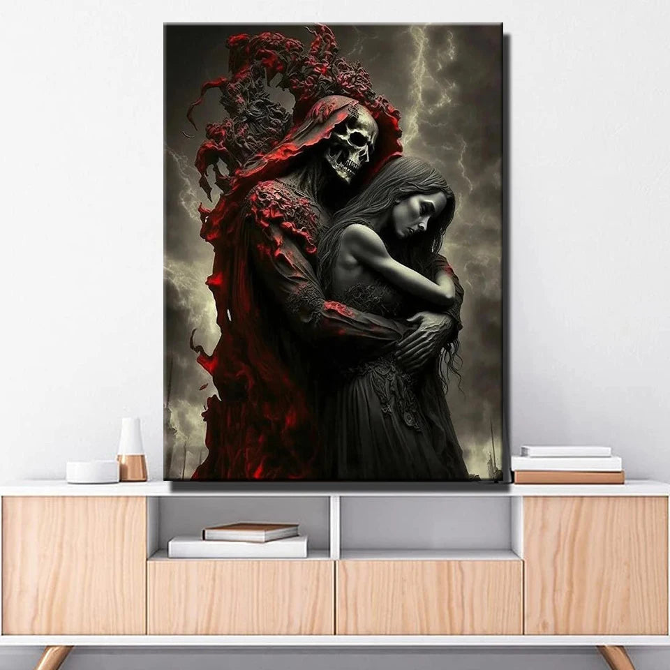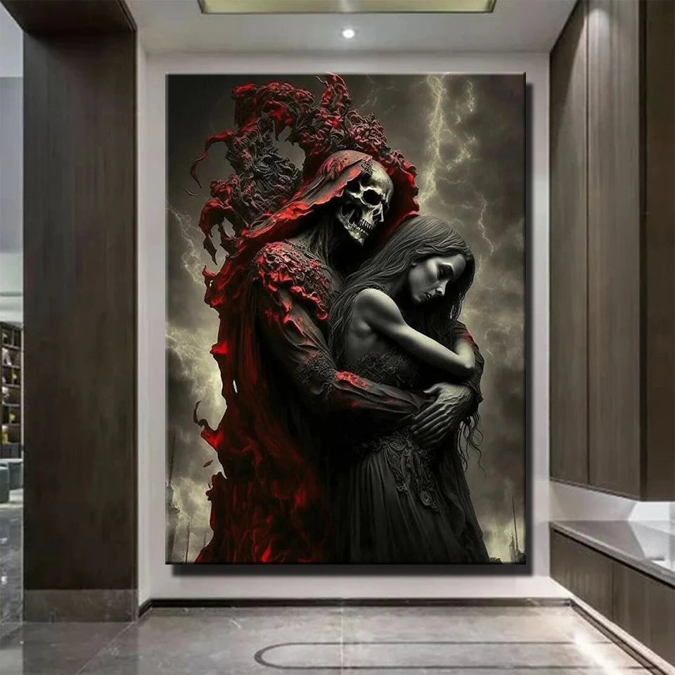 • Detailreiche Gothic-Fantasie: Ein düster-romantisches Paar im Mittelpunkt, das starke Emotionen und Tiefe vermittelt – ein echtes Highlight für Gothic-Wohnräume.