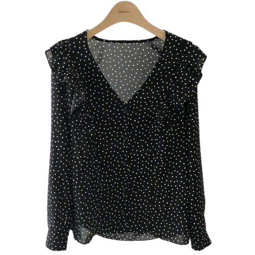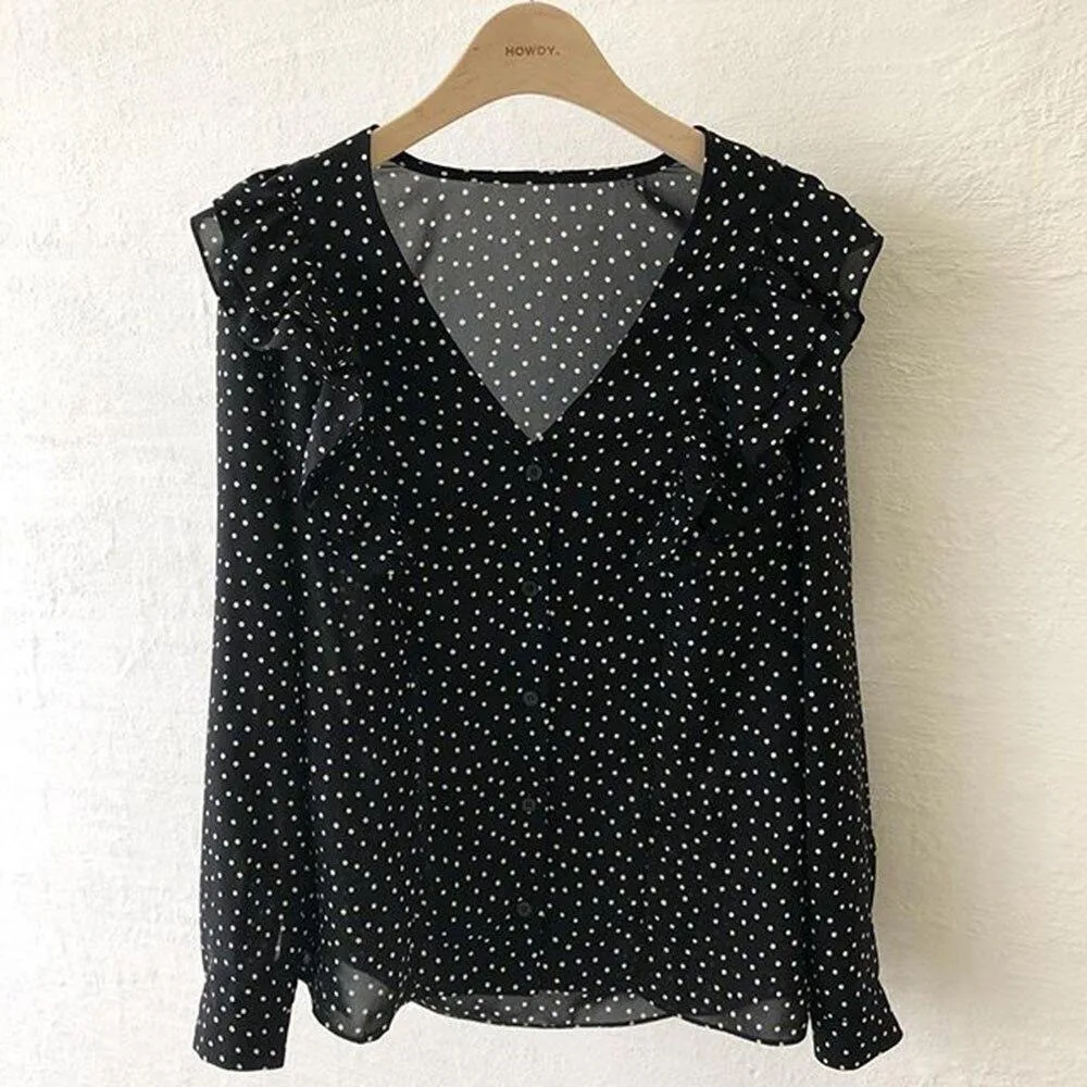 Elegante Gothic-Bluse mit Polka-Dots, perfekt für einen einzigartigen Look. Leichter Stoff und raffinierte Details für besondere Anlässe.