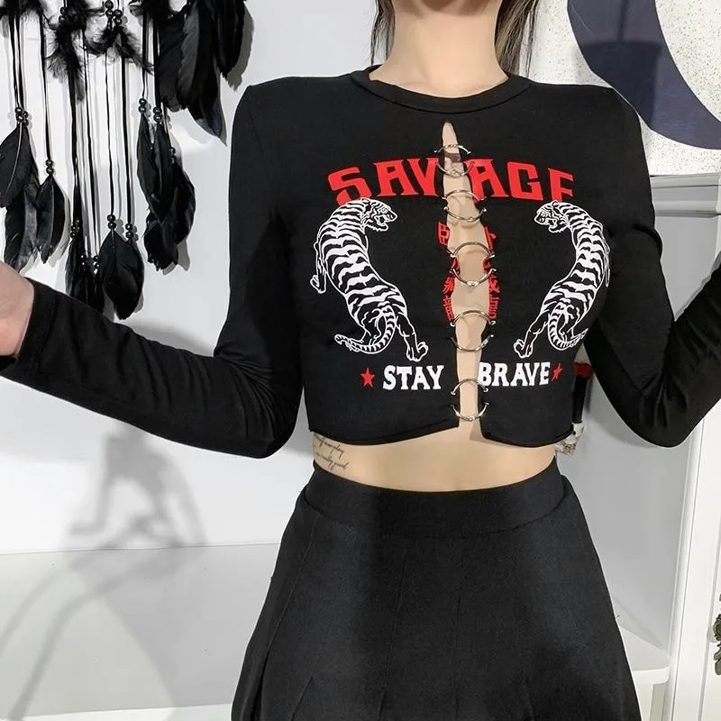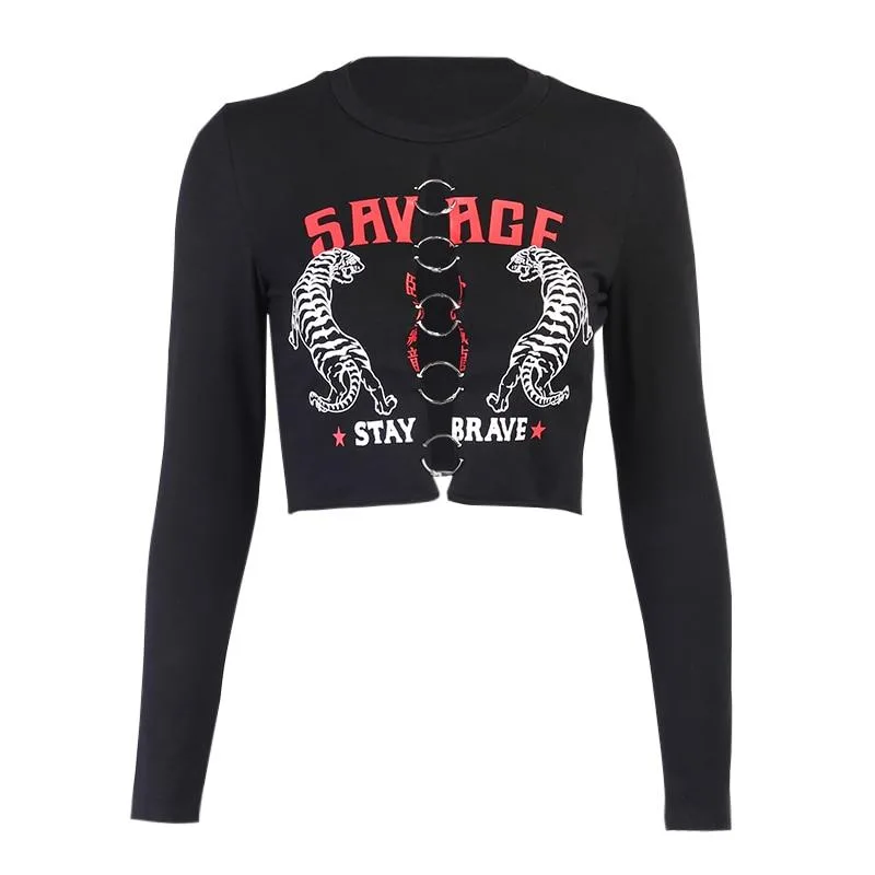 Entdecken Sie unser Gothic Crop Top Savage, das ultimative Kleidungsstück für Liebhaber des Gothic-Stils. Mit seinem unverwechselbaren Tiger-Print, den auffälligen Grafiken „Savage and Stay Brave“ und den einzigartigen O-Ringen setzt dieses Crop-Top neue Maßstäbe in Sachen Design und Ausdruck. Perfekt für den Alltag und Partynächte, ist dieses Gothic Crop Top ein Must-have für jede Garderobe.