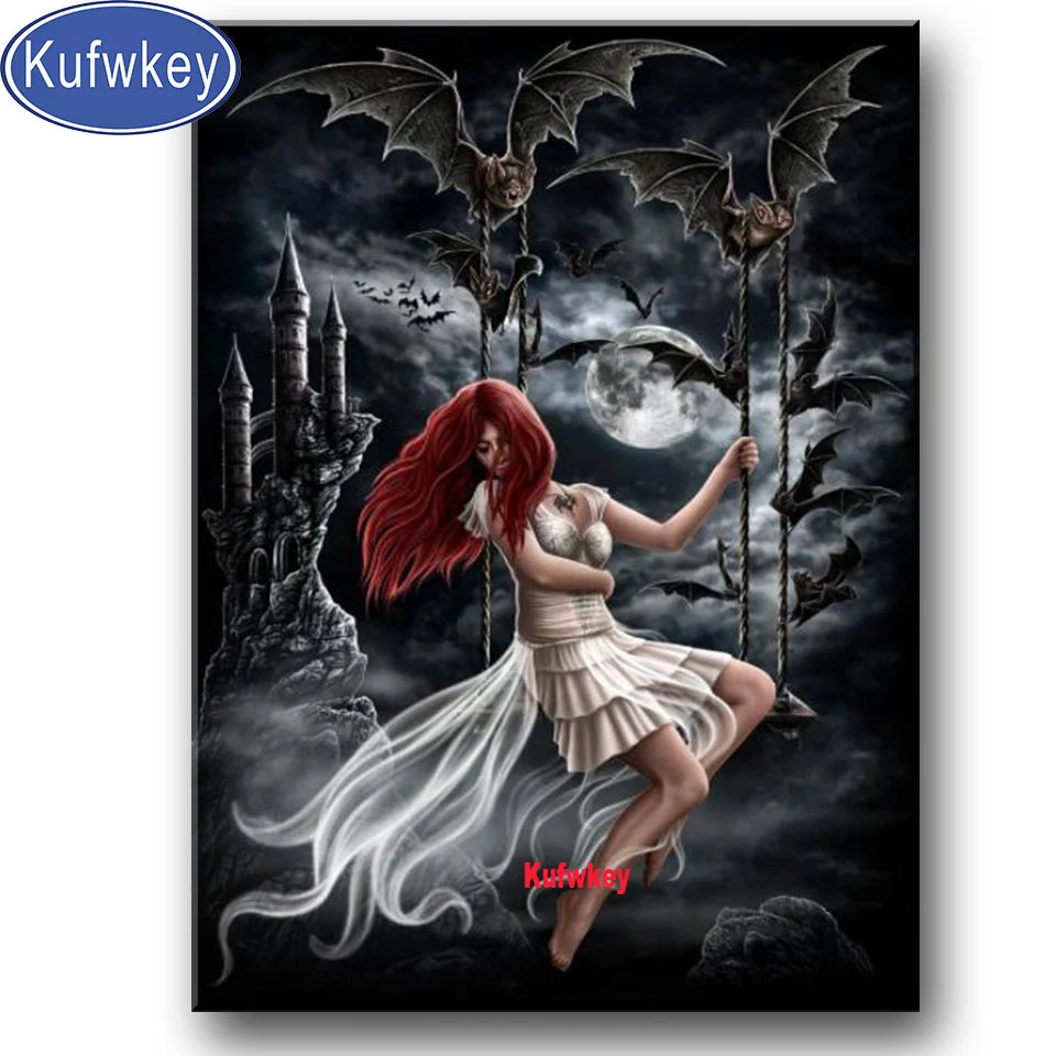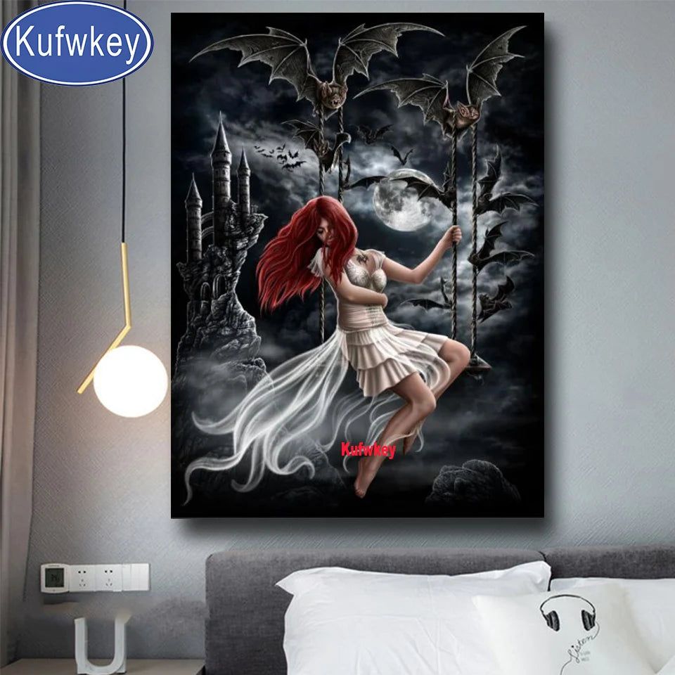 Erwecke düstere Eleganz mit der Gothic Diamond Painting „Draculas Bride“ – detailreiches DIY-Kunstwerk mit Engelsfledermaus und Kristallen.
