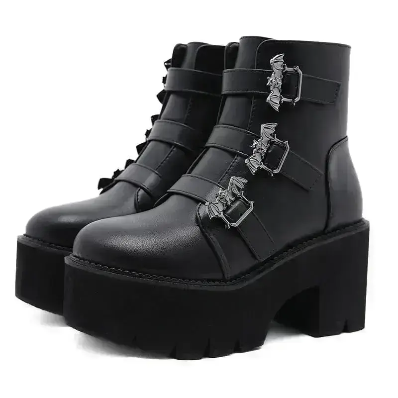 - Einzigartiges Design: Mit fledermausförmigen Schnallen und runden Spitzen sind diese Stiefeletten ein absolutes Highlight für alle Fans des düsteren Gothic-Stils.