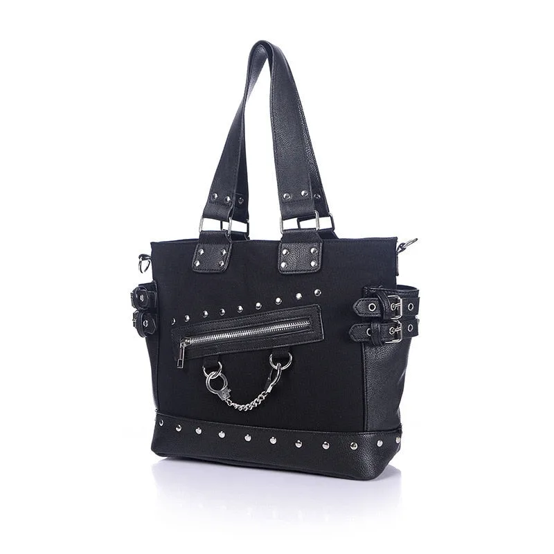 Entdecken Sie unsere Gothic Handtasche Vintage vernietet, die perfekte Begleitung für alle Liebhaber des gothischen und vintage Stils. Hergestellt aus hochwertigem Kunstleder und verziert mit Nieten, Schnallen, Ketten und Reißverschlüssen, vereint diese Tasche Funktionalität mit unverwechselbarem Design. Sie bietet nicht nur ausreichend Platz für das Nötigste, sondern ergänzt auch jedes Outfit auf eine einzigartige Weise.