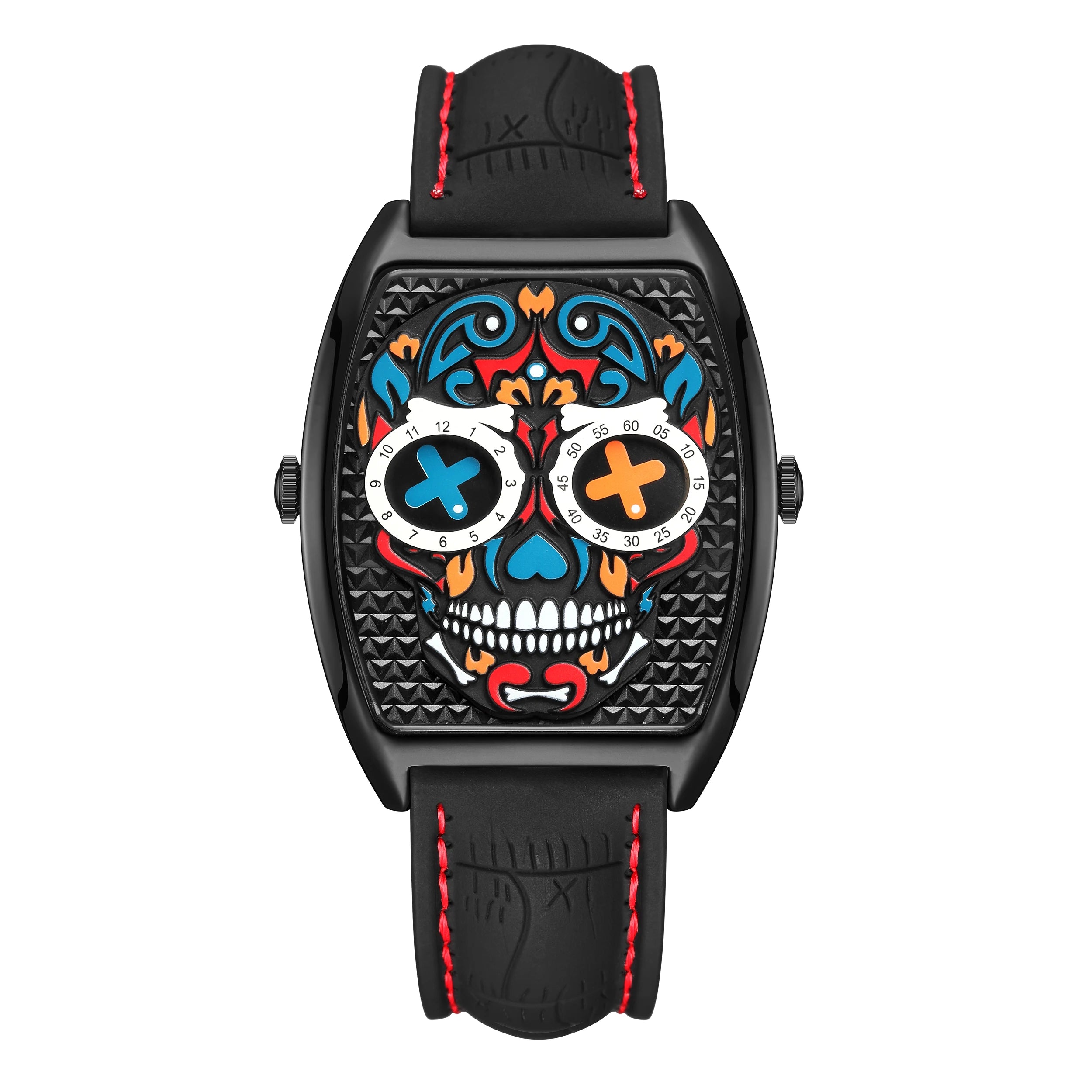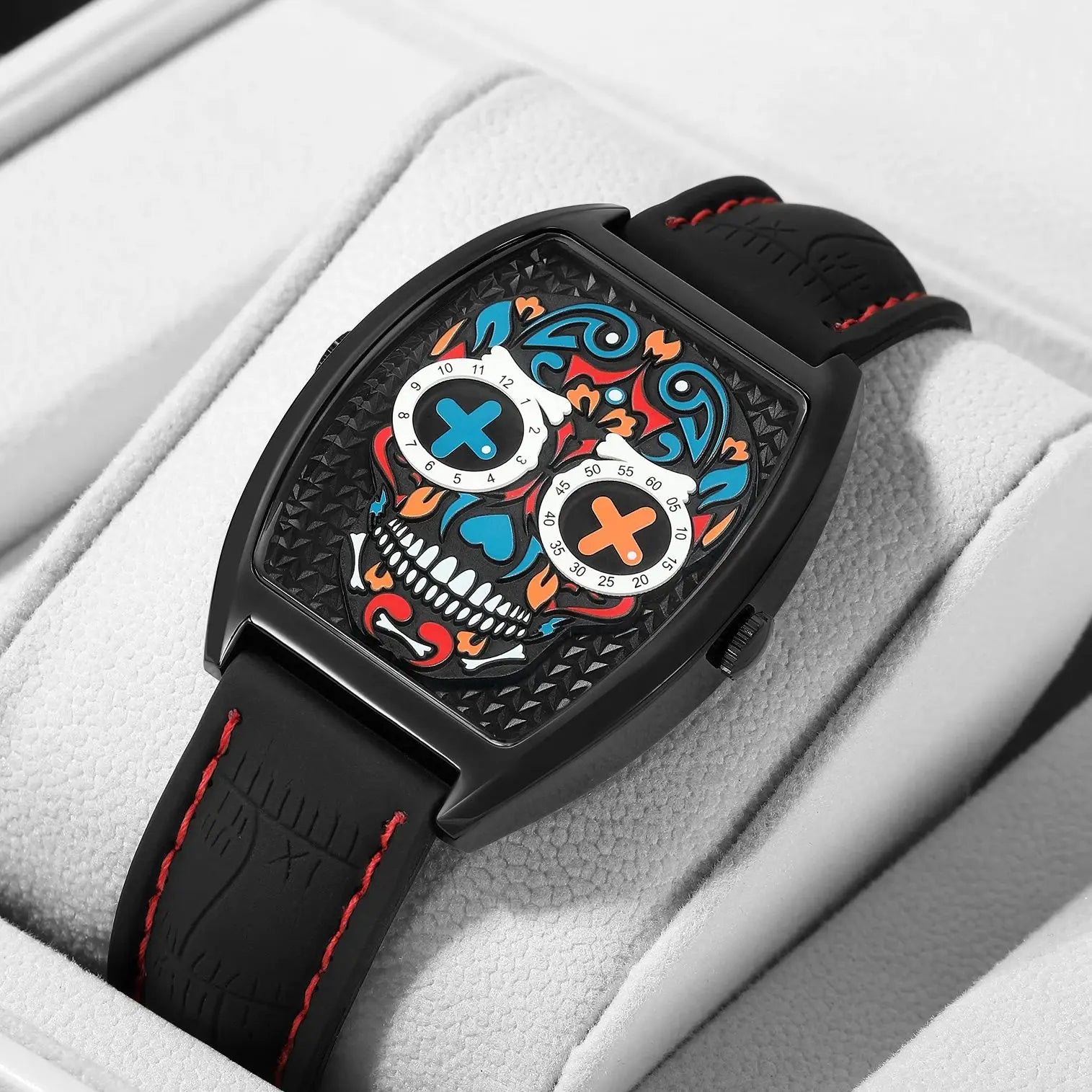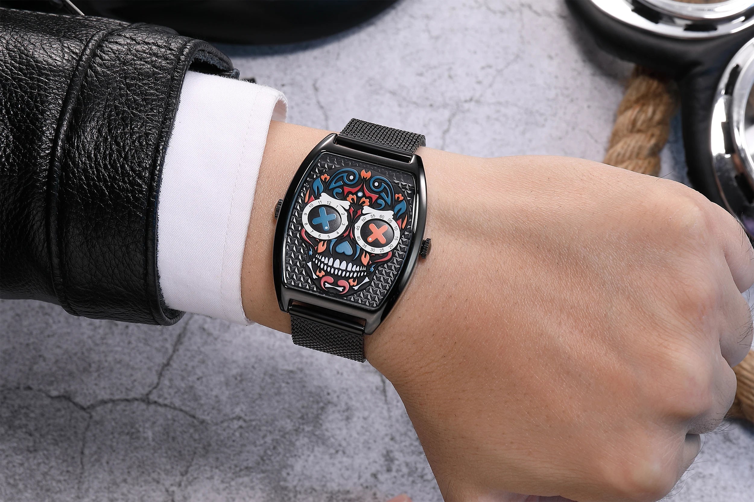 - Einzigartiges Design: Das auffällige Totenkopf-Motiv im Ziffernblatt sorgt für einen rebellischen Look, der garantiert alle Blicke auf sich zieht.