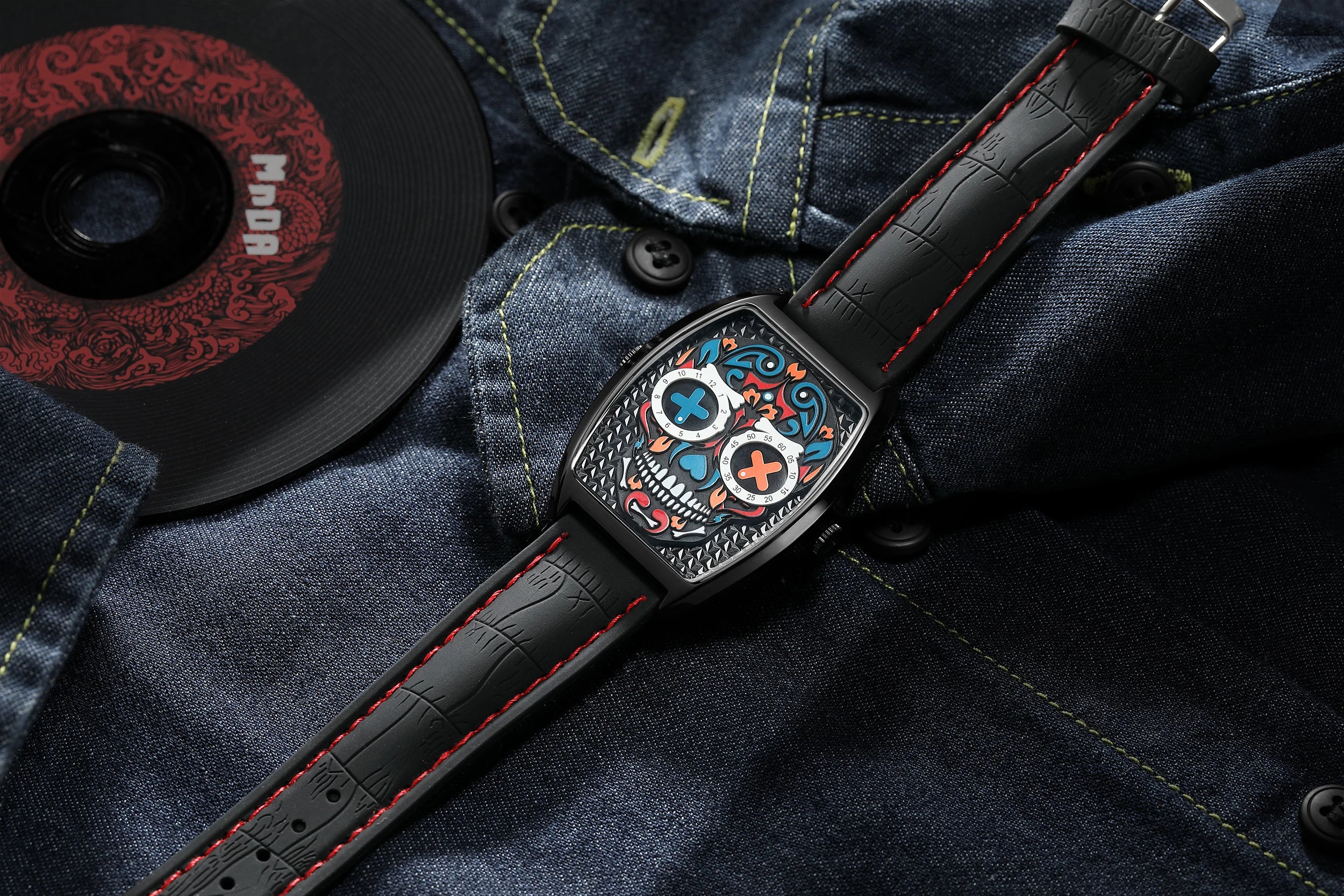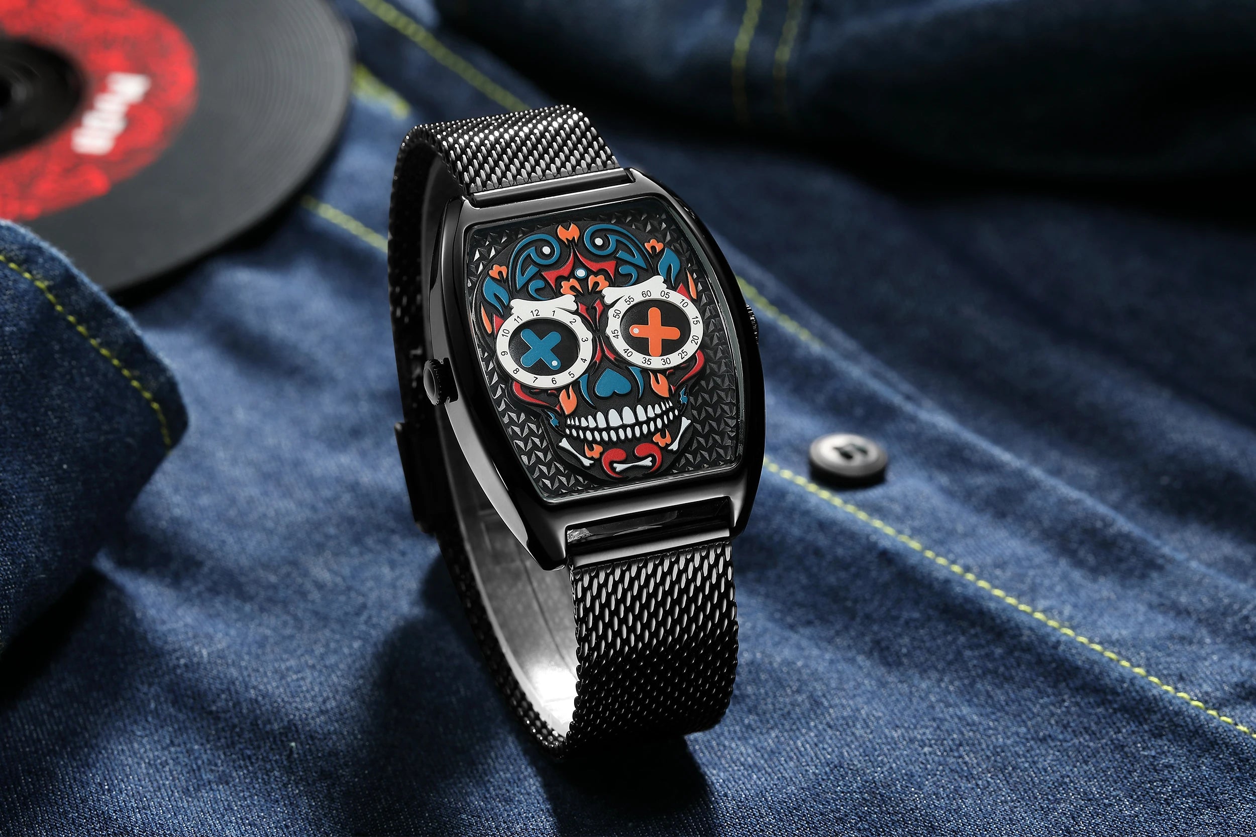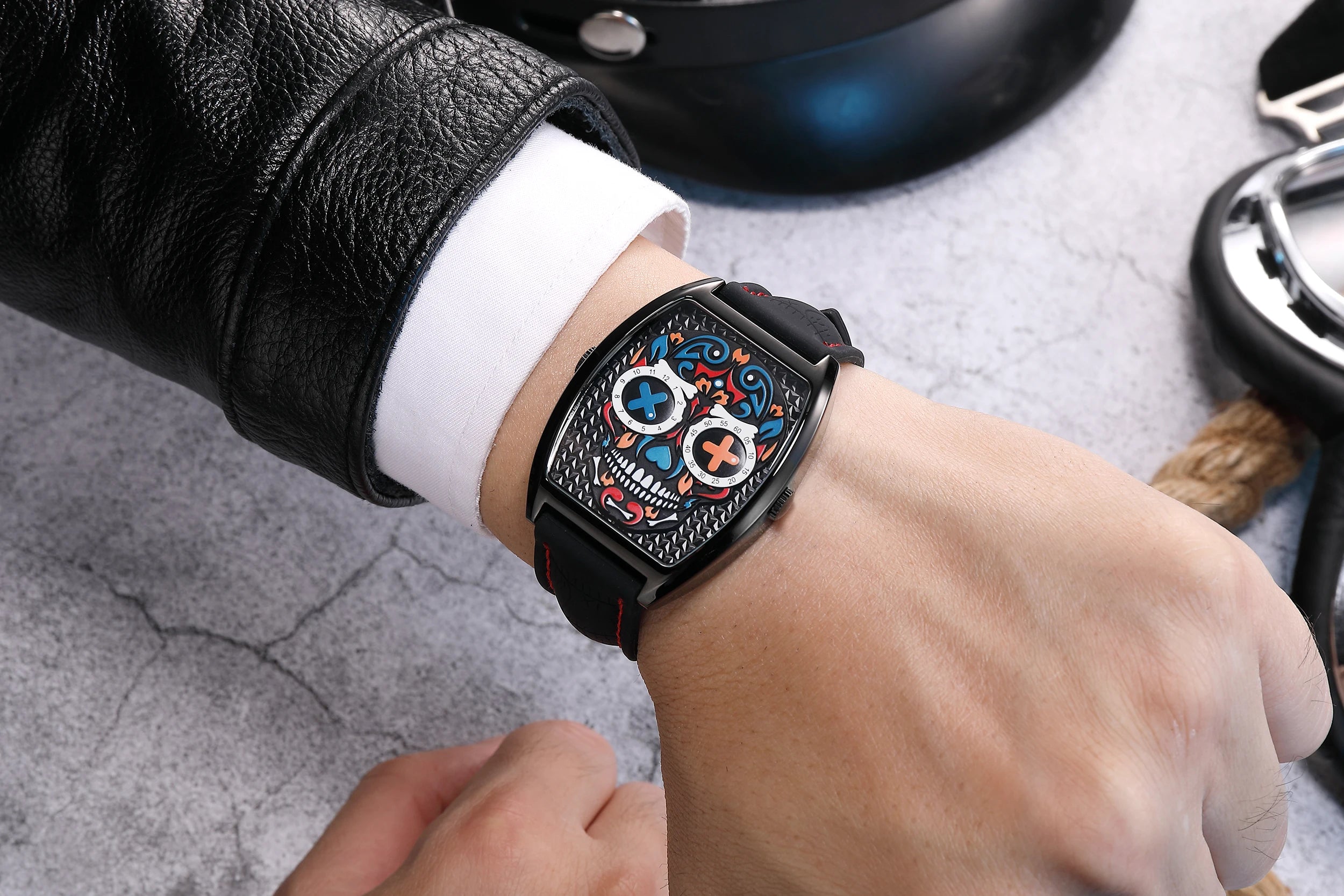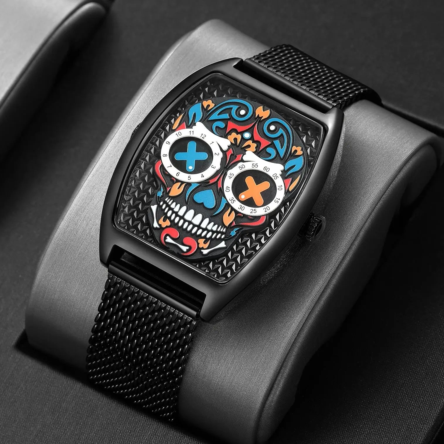 - Einzigartiges Design: Das auffällige Totenkopf-Motiv im Ziffernblatt sorgt für einen rebellischen Look, der garantiert alle Blicke auf sich zieht.