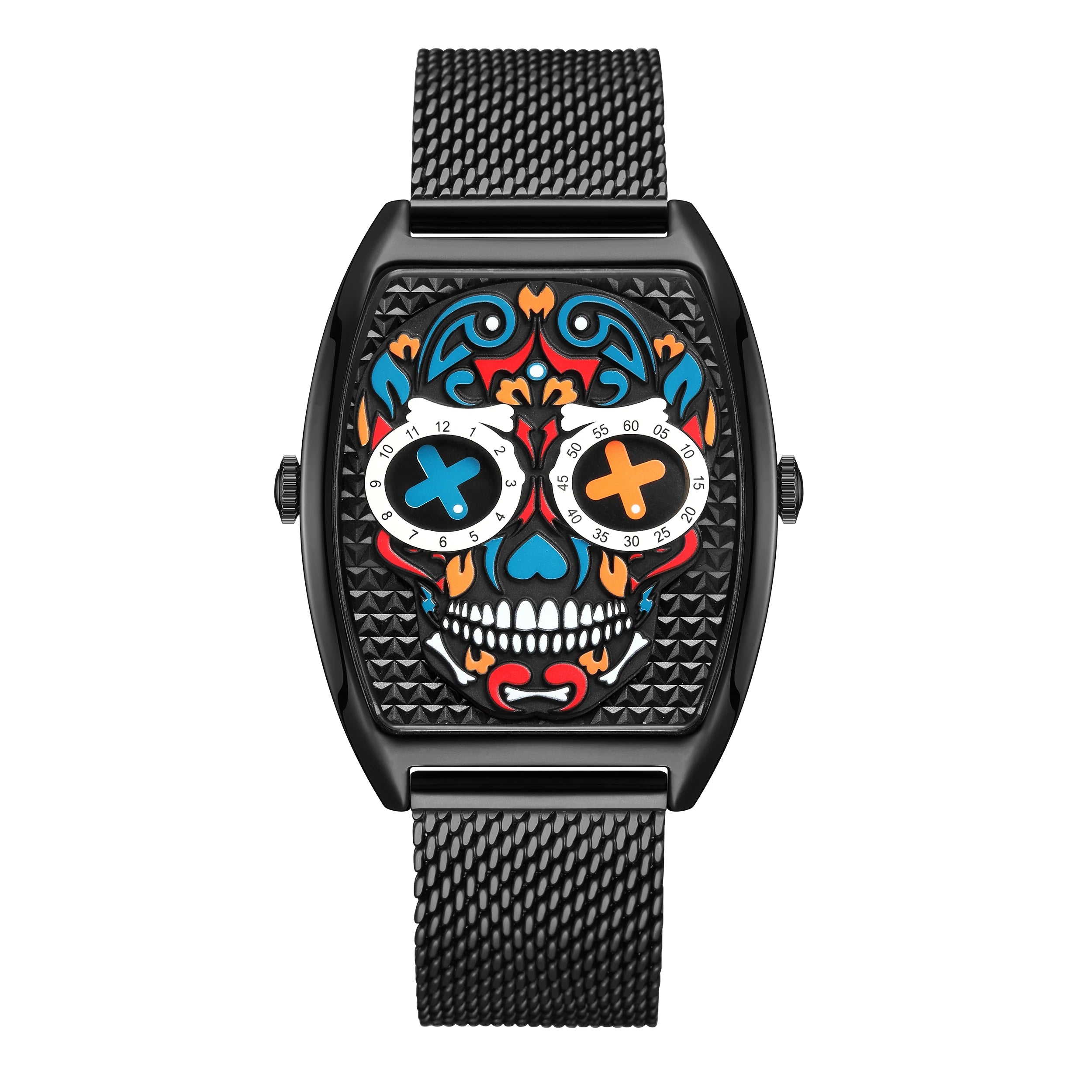 - Design: Tonneau-Gehäuseform mit markantem Skull-Motiv im Inneren
