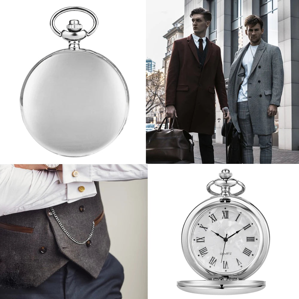 Entdecke die vintage Herrentaschenuhr im gothic Stil – Silberdesign mit Kette, ideal als charmantes Geschenk oder modisches Accessoire.