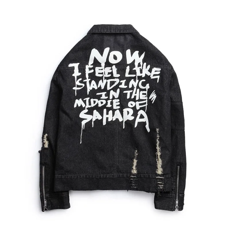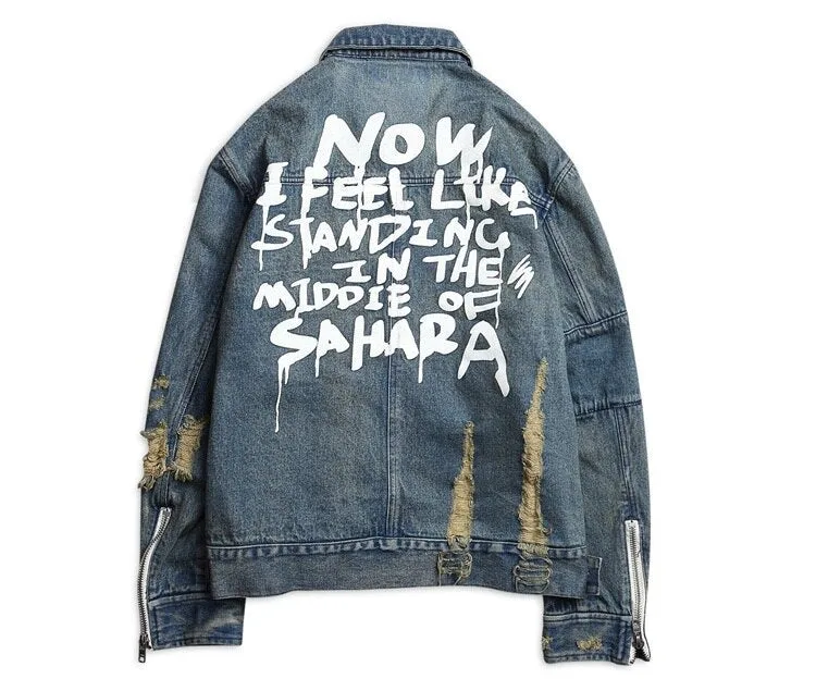 - Design: Ausgefranstes Vintage-Design mit auffälligen Reißverschlüssen und einem Rückendruck