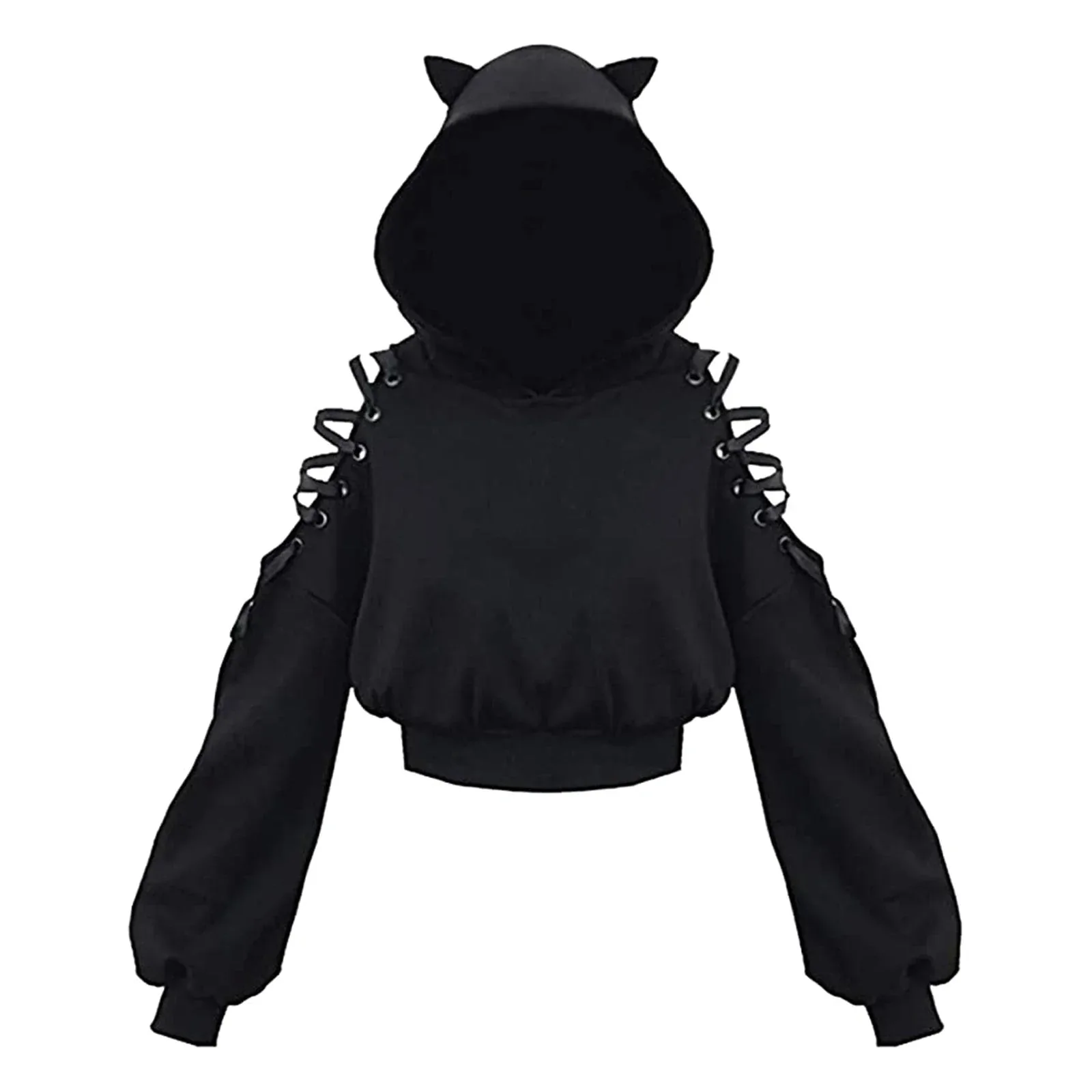 • Einzigartiges Design: Die Kapuze mit niedlichen Katzenohren und Schnürdetails an den Schultern verleiht dem Pullover einen geheimnisvollen und spielerischen Touch.