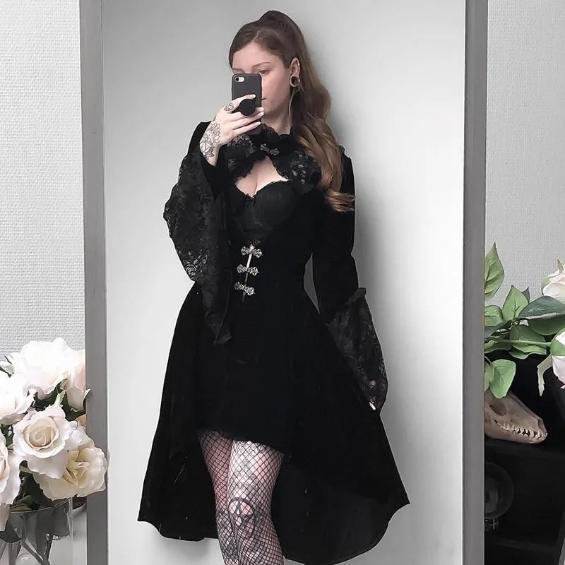 Kombinieren Sie dieses Gothic Kleid Vintage Samt mit einem kurzen Gothic-Kleid, um einen perfekten Party-Look zu kreieren. Ergänzen Sie Ihren Stil mit unseren sexy Gothic-Kleidern oder einem Gothic Style Dress für einen vielseitigen, eleganten Auftritt.
