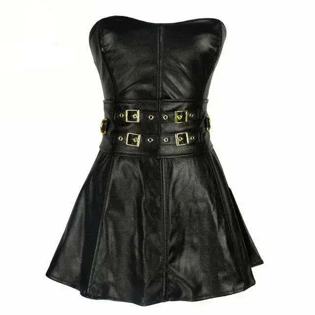 - Vielfältige Details: Korsett mit Schnürung, Reißverschluss und trägerlosem Ausschnitt sowie einem plissierten, ausgestellten Rock mit Trägern und Schnallen.