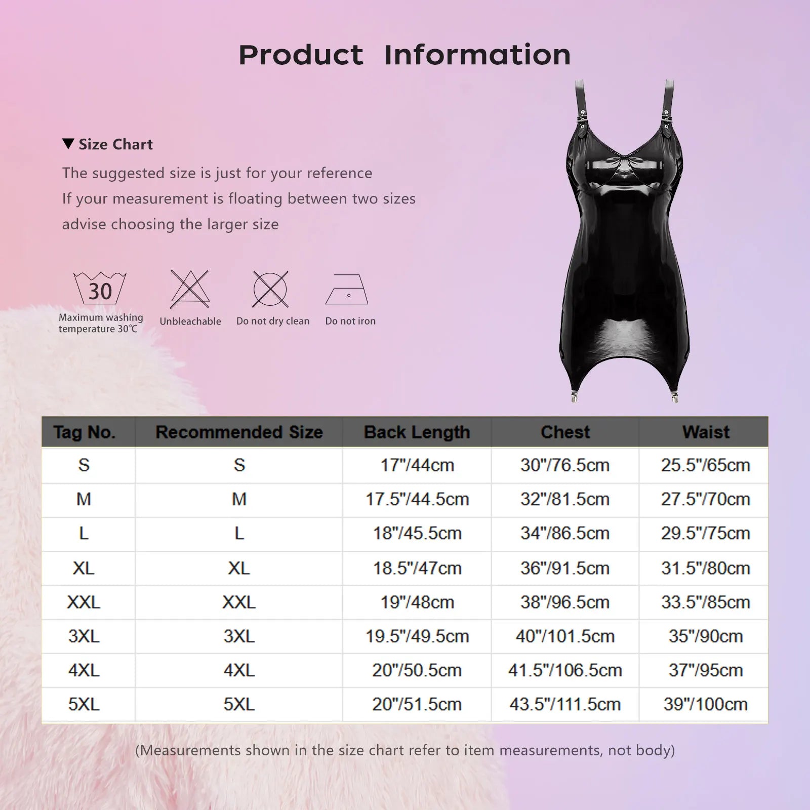 • Design: Rückenreißverschluss, glänzender Lacklook, verstellbare Träger, Strumpfhalter