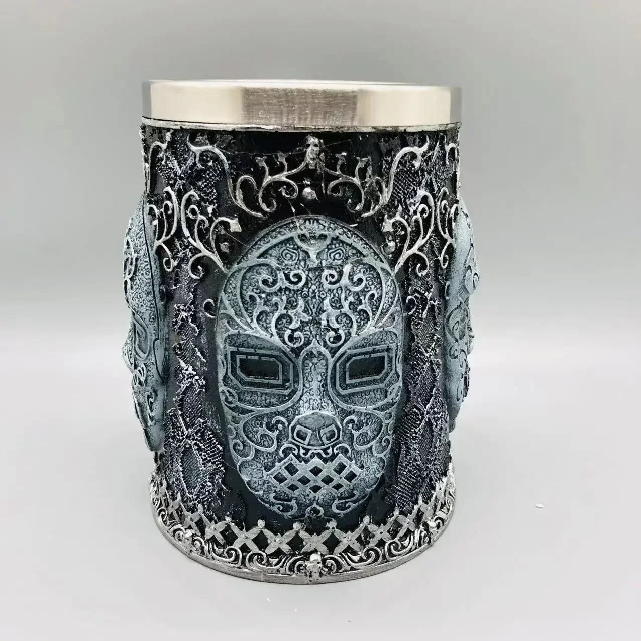 Verleihen Sie Ihrem Zuhause oder Ihrer Sammlung einen düsteren, stilvollen Touch – mit dem Gothic Maske Becher aus Edelstahl – 3D Design 200/600ML. Ideal für Sammler, Gothic-Fans und als Präsent für besondere Anlässe!