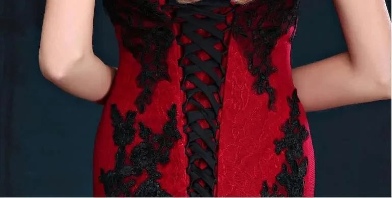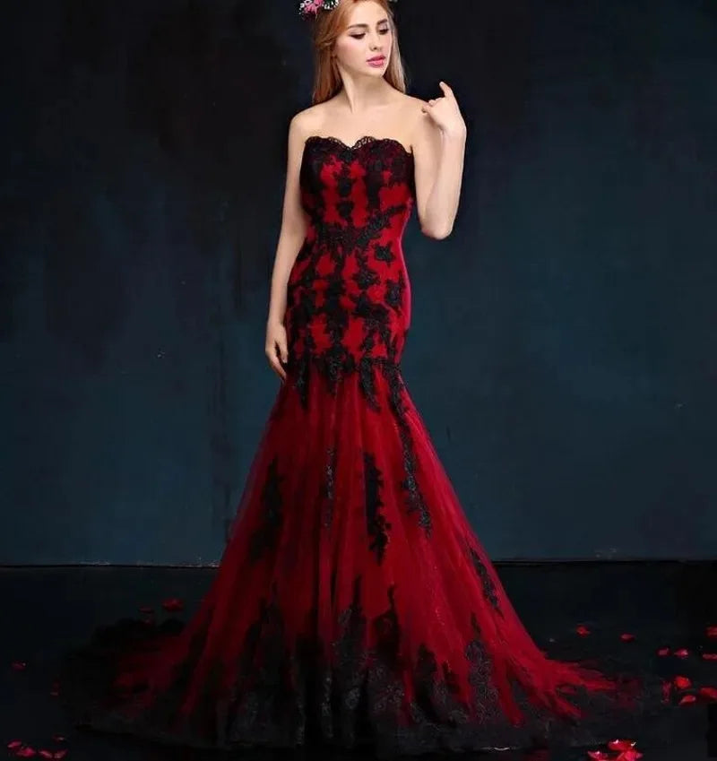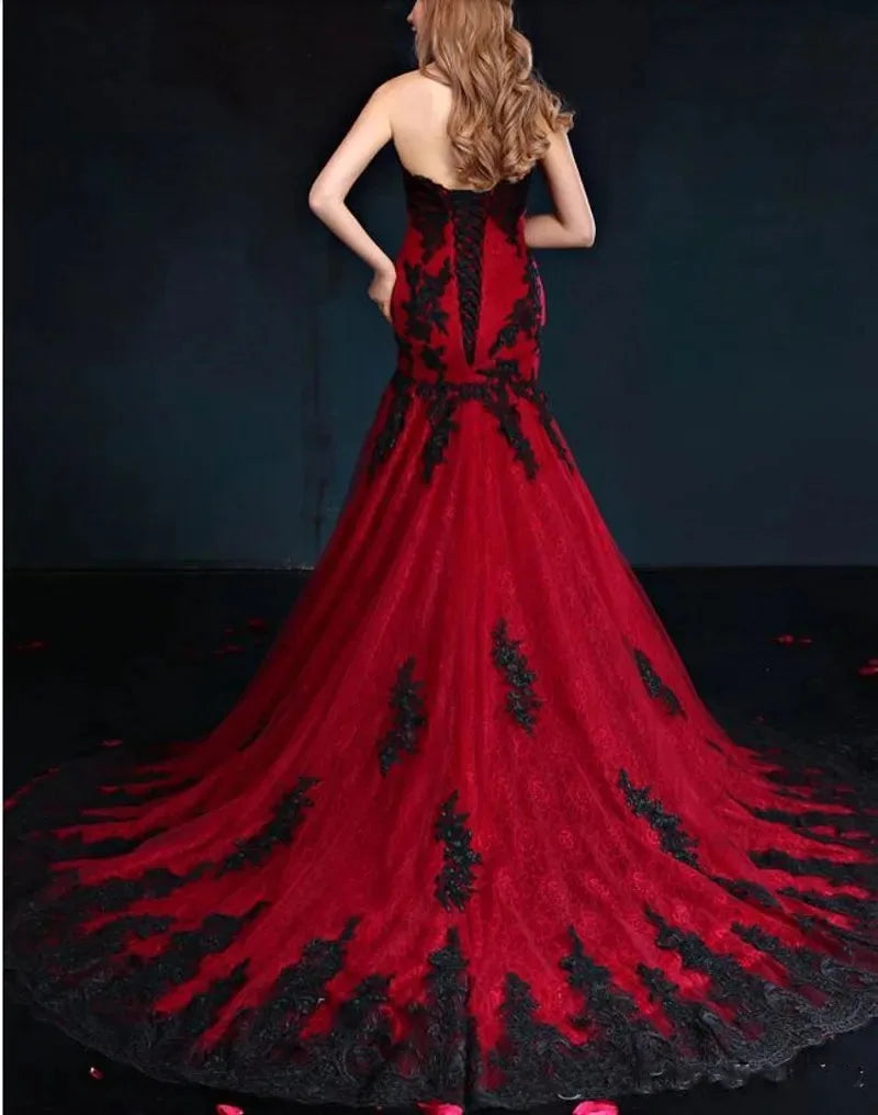Gothic Mermaid Brautkleid in Schwarz/Rot mit Spitze