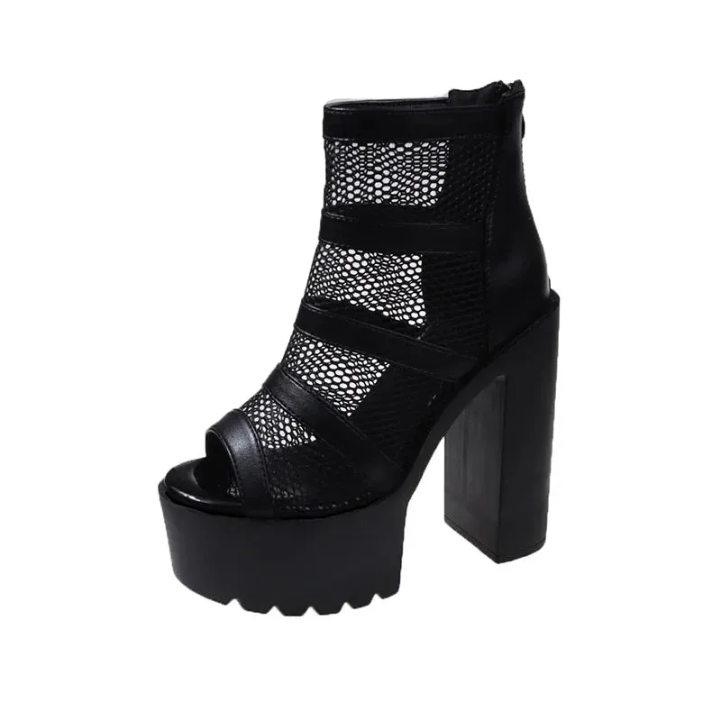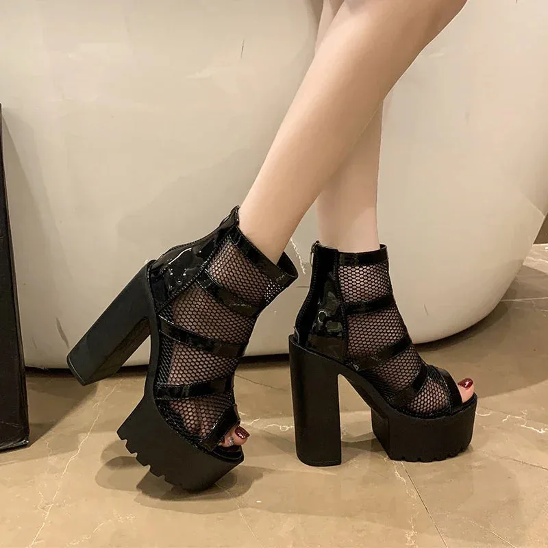 Stylische Gothic Mesh Sandalen mit Absatz – perfekt für ein elegantes, dunkles Outfit. Kombinieren Sie Komfort mit einem einzigartigen Look!