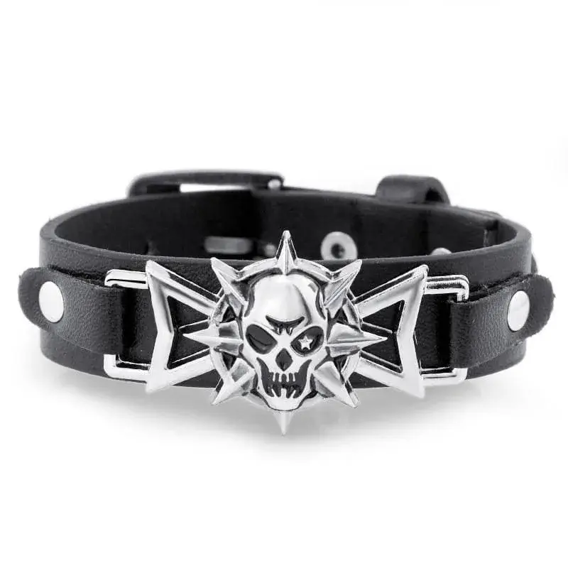 Gothic Punk Armband mit Totenkopf-Motiv und Gürtelschnalle. Verstellbar, robustes Design aus Leder und Metall. Perfekt für deinen alternativen Stil!