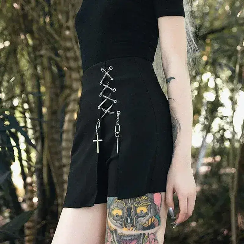 - Vielseitiges Design: Die Vorderseite gleicht einem Rock und wird mit einer kleinen Silberkette verziert, was den ikonischen Punk-Stil unterstreicht. Die Rückseite hingegen, die wie Shorts gestaltet ist, bietet zusätzlichen Komfort und Bewegungsfreiheit.