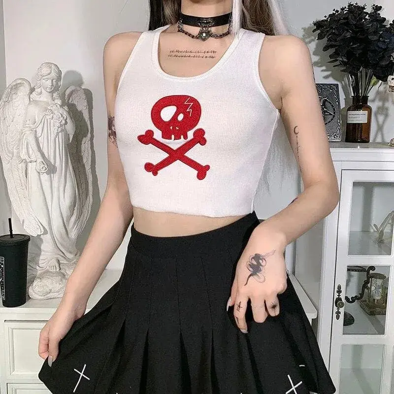 - Design: Totenkopf-Print in Rot auf einem weißen Hintergrund
