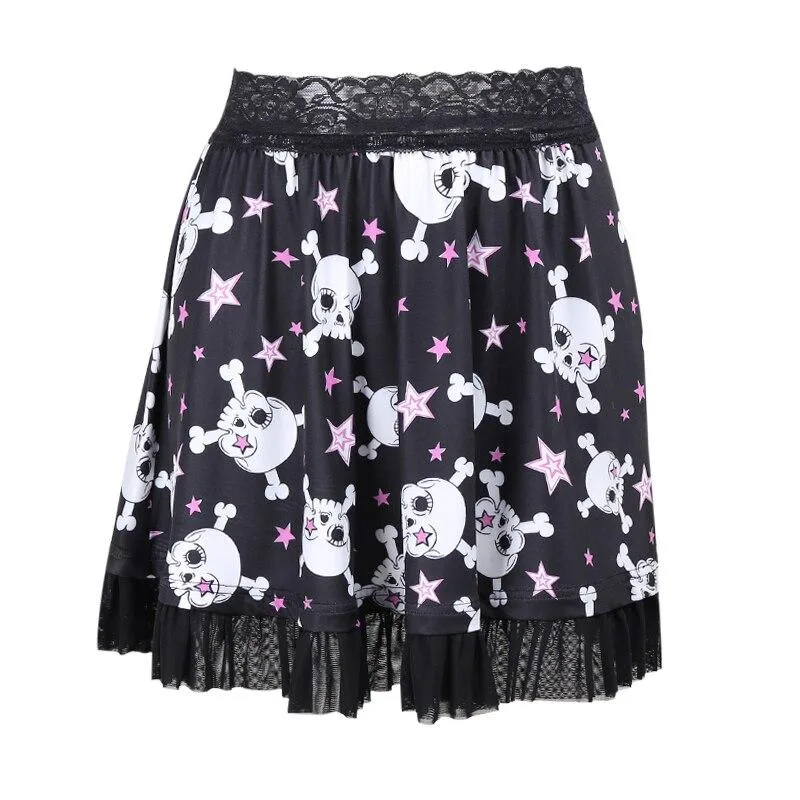 - Einzigartiges Design: Totenkopf- und Sternenmuster kombiniert mit einem Spitzenbund und transparentem Rüschenbesatz.