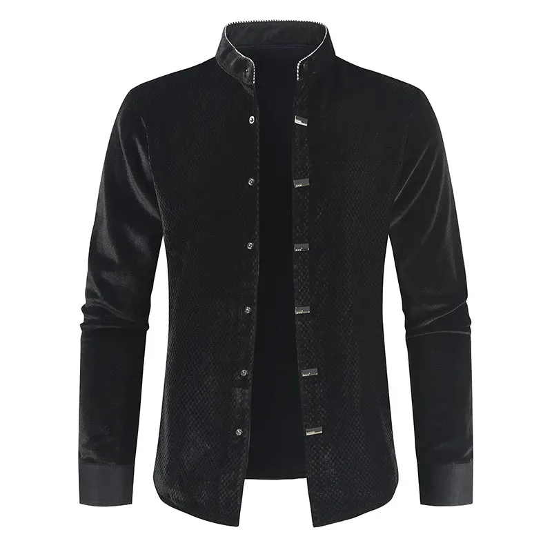 Entdecken Sie unser Gothic Samthemd, das Meisterwerk dunkler Eleganz im Gothic-Stil. Dieses außergewöhnliche Kleidungsstück kombiniert hochwertigen Samt mit auffälligen metallischen Druckknöpfen, um Ihrem Look eine mystische Tiefe und einen luxuriösen Touch zu verleihen. Perfekt für Alltag und Abendveranstaltungen – das Gothic Samthemd zieht garantiert alle Blicke auf sich.