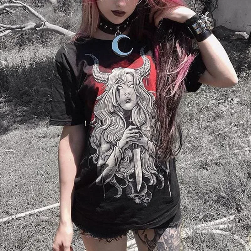 Stylisches Gothic Satan T-Shirt für Damen mit Teufelin-Motiv. Perfekt für Punk-Gothic-Looks. Oversized, bequemer Schnitt, ideal zu jeder Jahreszeit!