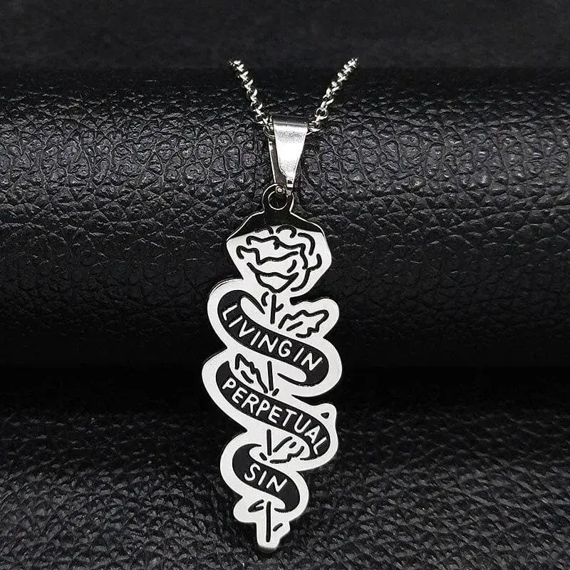 - Einzigartiges Design: Der Anhänger, geprägt mit einer schwarzen Rose und einer feinen Gravur „Living in Perpetual Sin“, verkörpert den puren Gothic-Stil.