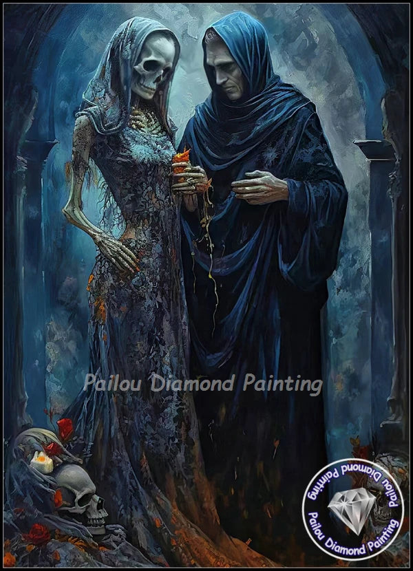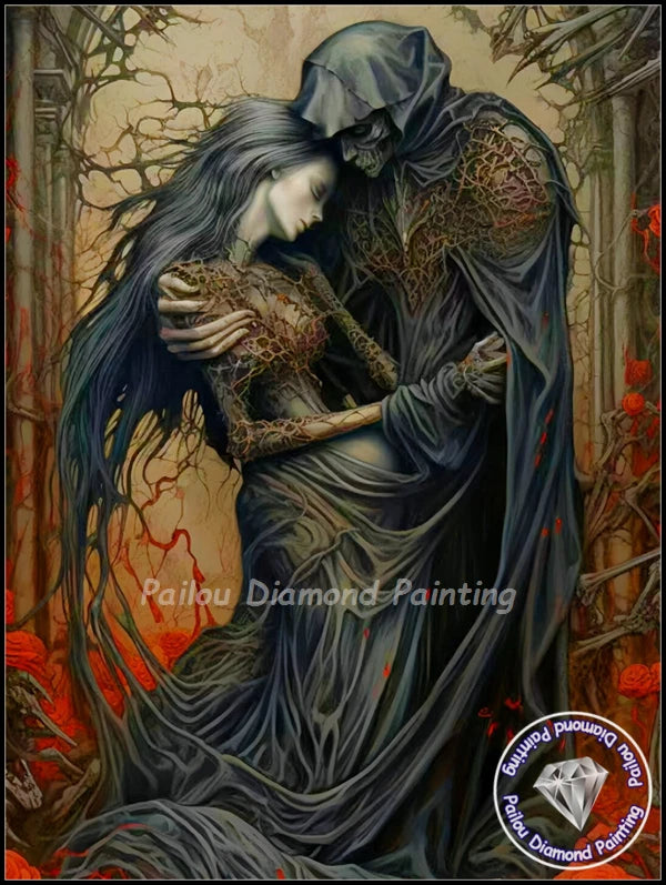 - Symbolische Darstellung: Ein Skelettpaar, umgeben von düsteren Blumen und dem Sensenmann, fängt die Essenz von ewiger Liebe und dunkler Schönheit ein.