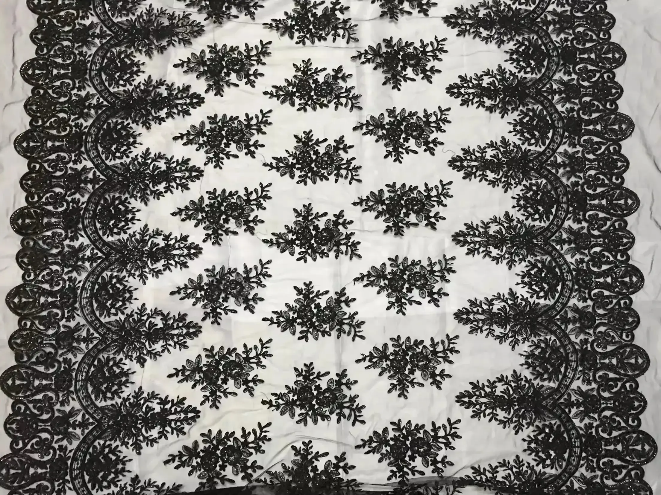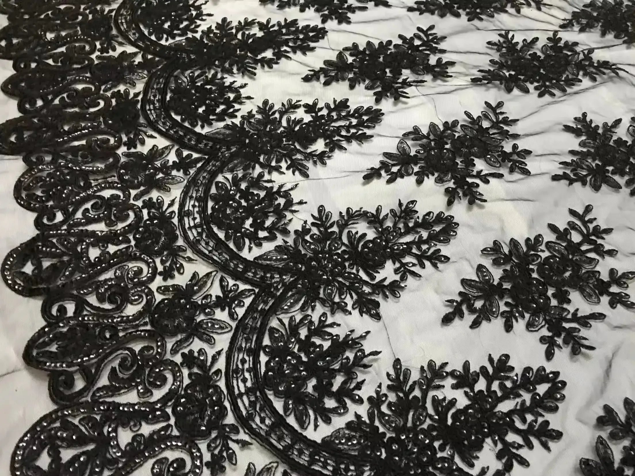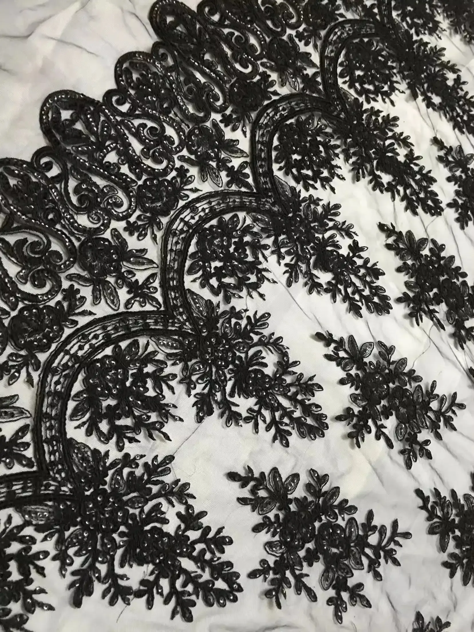 Der Gothic Spitzenstoff mit schwarzer Paillette bestickt wird als Meterware angeboten. Jeder Schnitt beträgt 1 Yard in der Länge (ca. 91 cm) und 130 cm in der Breite – perfekt für Kleider, Umhänge, Röcke und mehr.