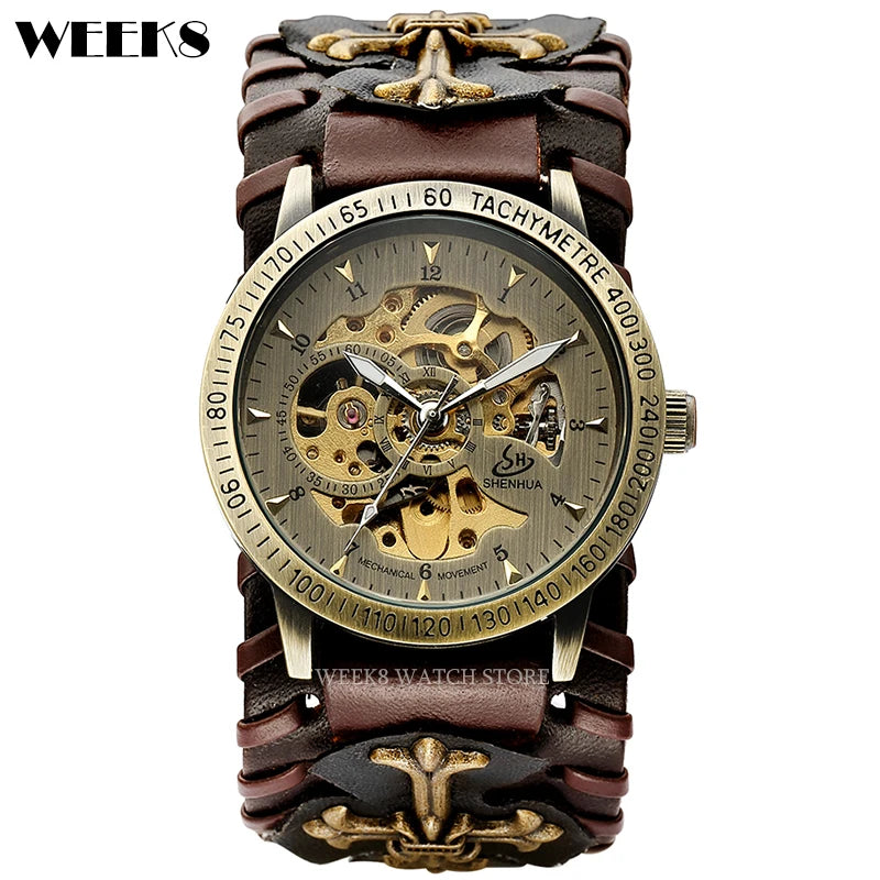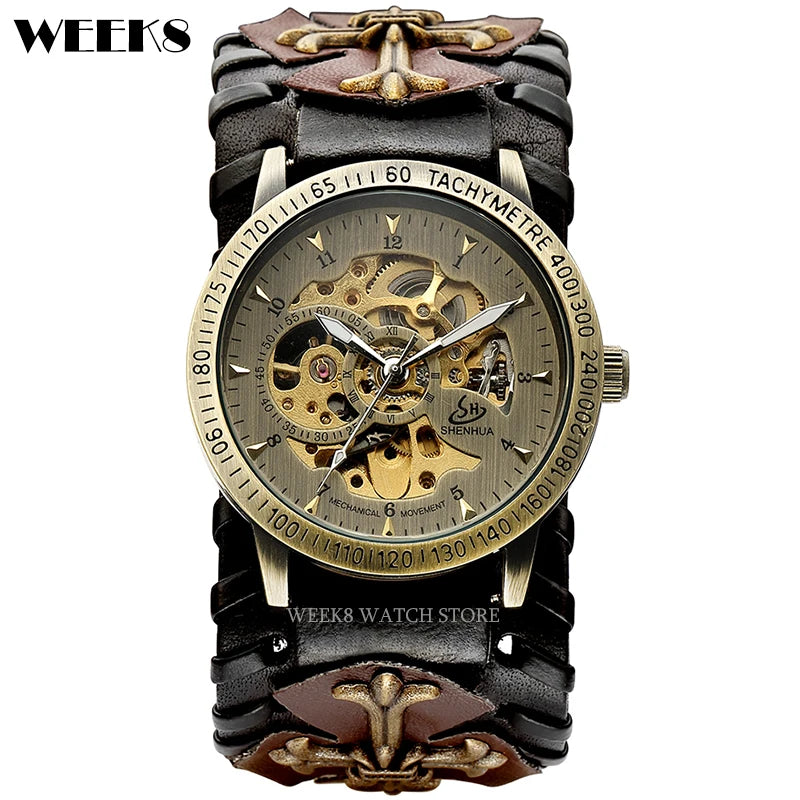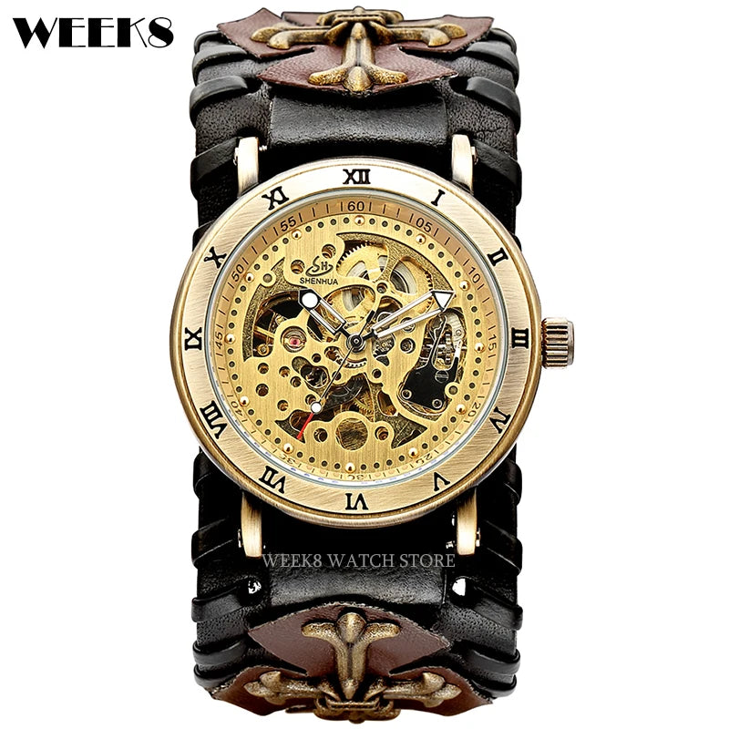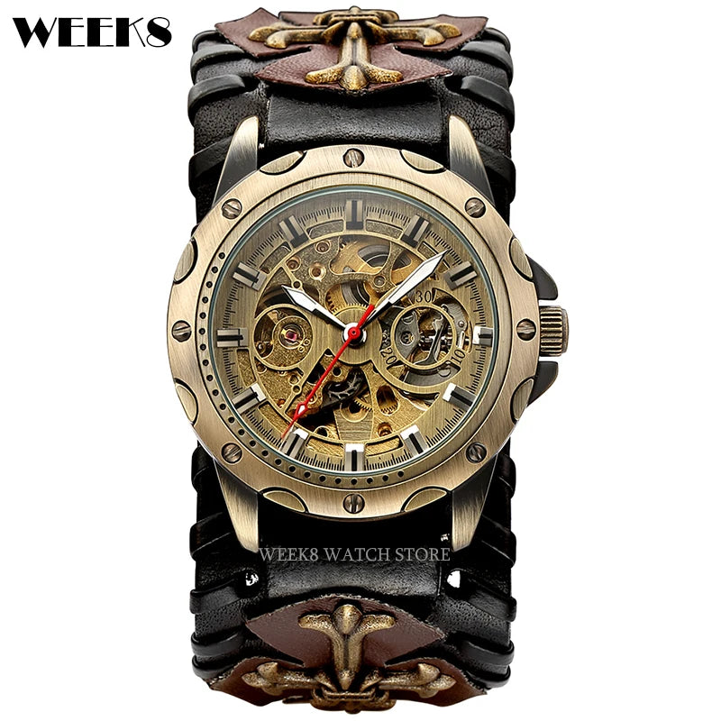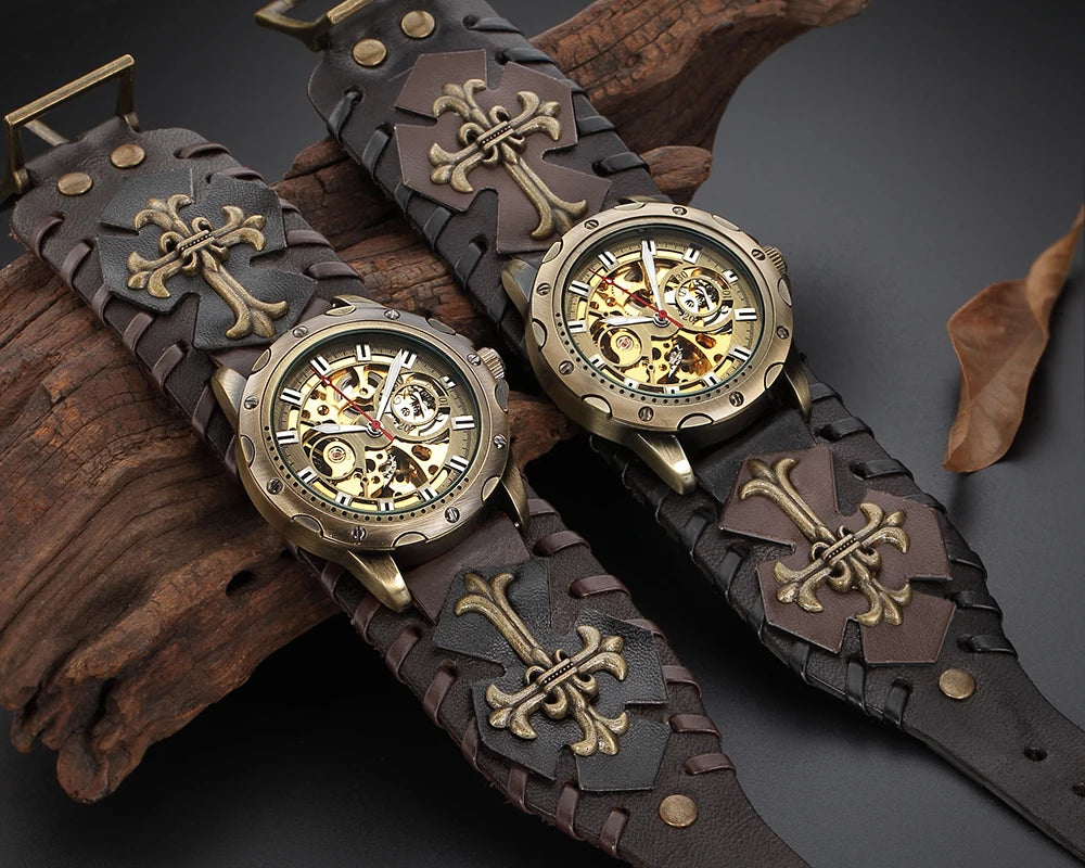 - Design: Steampunk-inspiriertes Skelett-Ziffernblatt mit mechanischem Handaufzug