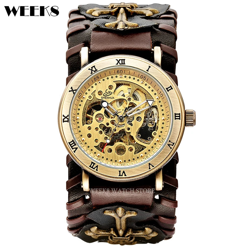 Entdecken Sie die Gothic Steampunk Herren-Uhr mit Skelettdesign Bronze – ein unverzichtbares Accessoire für Liebhaber des Steampunk- und Gothic-Stils. Diese mechanische Armbanduhr kombiniert klassisches Design mit aufwendiger Technik und verleiht Ihrem Auftritt eine stilvolle, maskuline Note. Perfekt für besondere Anlässe oder als tägliches Statement-Piece ist diese Uhr ein Must-Have für jeden, der Stil und Mechanik zu schätzen weiß.