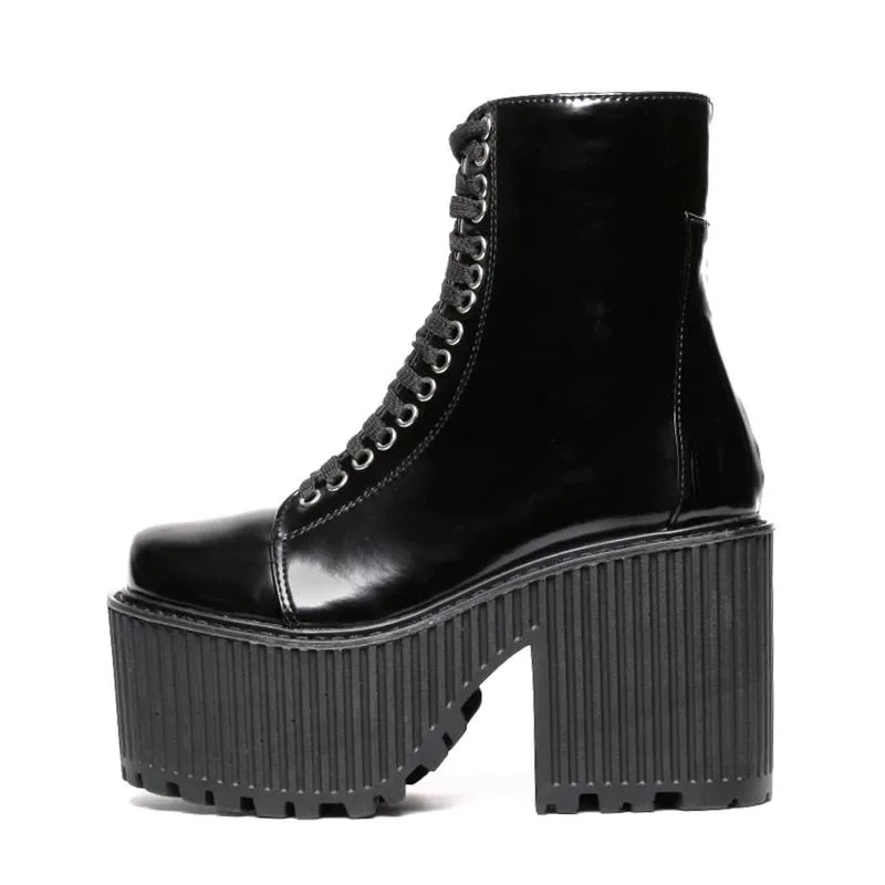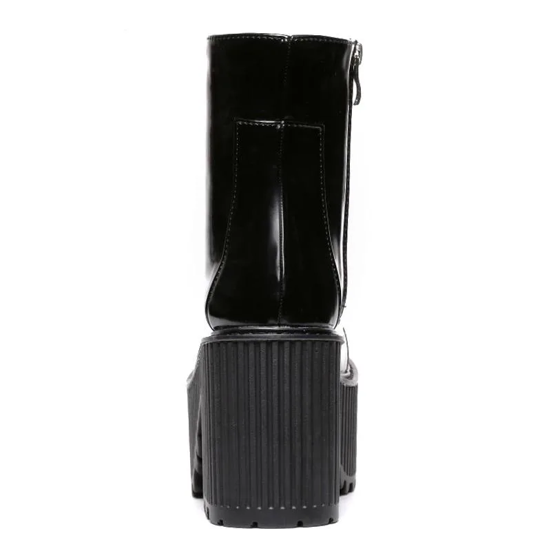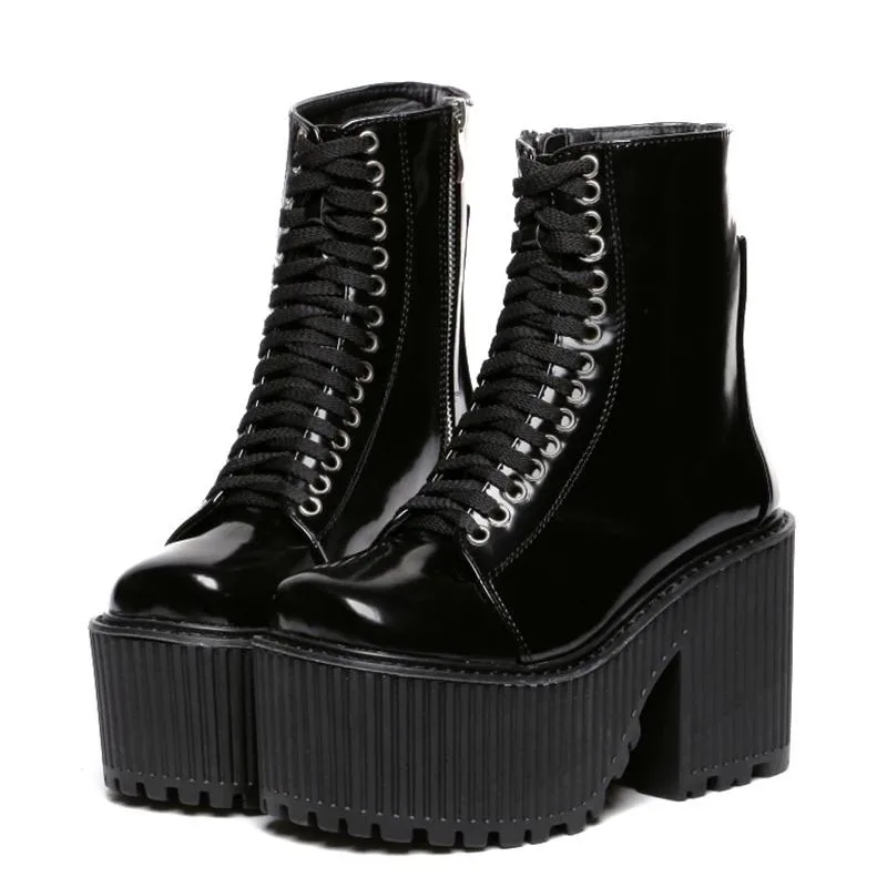 Erleben Sie den unvergleichlichen Stil und die Eleganz unserer Gothic Stiefel aus glänzendem Leder. Diese einzigartigen Plateaustiefel sind der perfekte Begleiter für alle, die ihrer Gothic-Garderobe ein mutiges Statement hinzufügen möchten. Mit ihrem auffälligen Design und hochwertigen Materialien verbinden sie Ästhetik und Komfort in perfekter Harmonie.