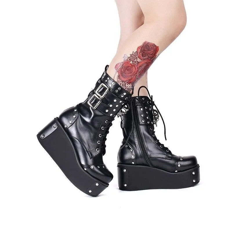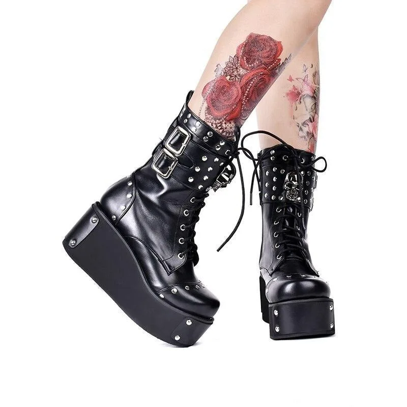 - Rebellisches Design: Die Totenkopf-Dekoration und die hohen Plateausohlen machen diese Stiefel zu einem echten Hingucker.