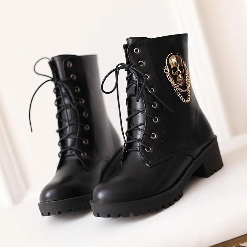 - Design: Schnürstiefelette mit auffälliger Totenkopf-Dekoration.