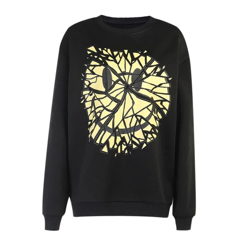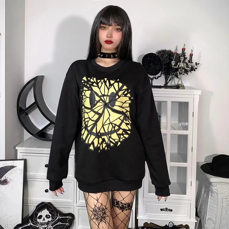 Entdecken Sie unser Gothic Sweatshirt mit Smiley, ideal für Liebhaber des einzigartigen Gothic-Stils. Dieses schwarze Sweatshirt mit einem ikonischen gelben Smiley-Motiv, das in tausend Teile zerbrochen ist, vereint Stil und Komfort. Perfekt für den Alltag, Herbst und Winter, bietet es einen unverwechselbaren Look, der nicht unbemerkt bleibt.