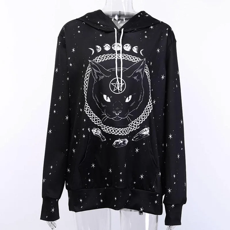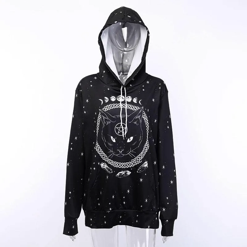 - Einzigartiges Design: Mit einem beeindruckenden Aufdruck einer schwarzen Katze und mystischen Symbolen, perfekt für den Gothic-Look.