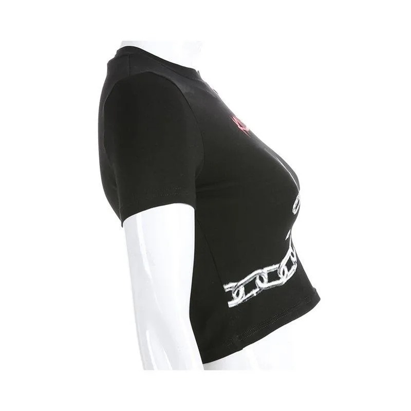 • Design: Schwarzes T-Shirt mit Ketten- und Schlossmotiven