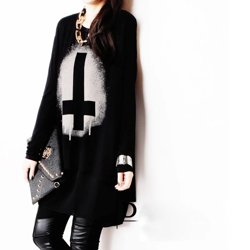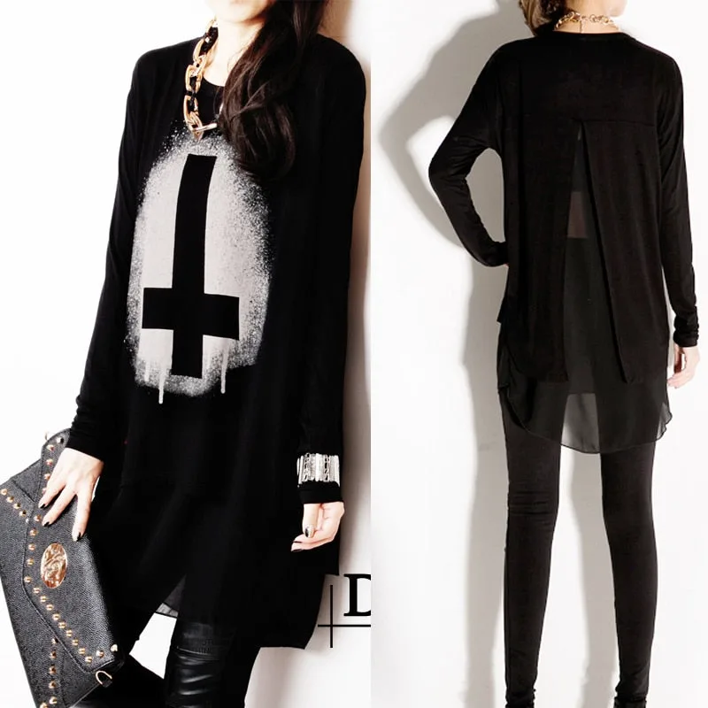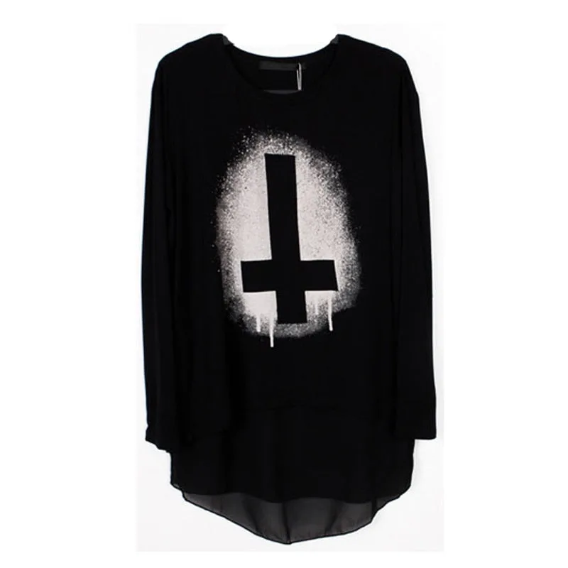 Entdecken Sie unser Gothic T Shirt Langarm, ein unverzichtbares Kleidungsstück für Liebhaber des Gothic-Stils. Gefertigt aus hochwertiger Baumwolle und Chiffon, vereint dieses T-Shirt Komfort und Eleganz und eignet sich perfekt für den Alltag oder besondere Anlässe. Das schwarze Design mit einem umgekehrten Kreuzmuster auf der Vorderseite macht es zu einem absoluten Hingucker.