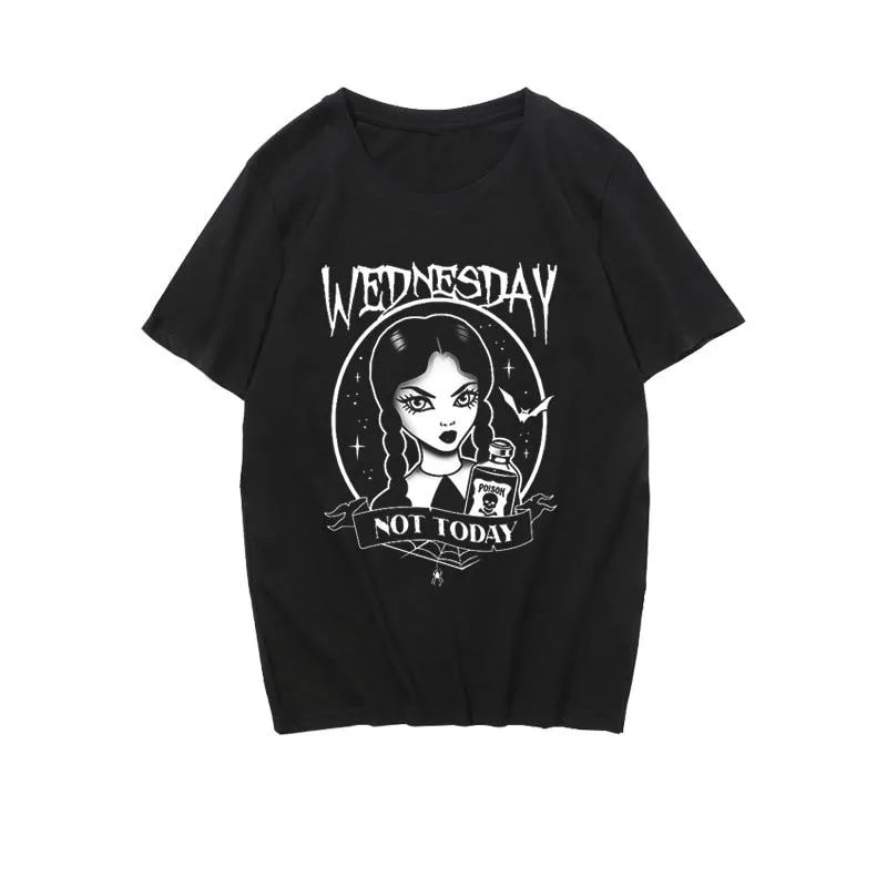 - Design: Elegantes schwarzes T-Shirt mit einem auffälligen „Wednesday Not Today“-Motiv