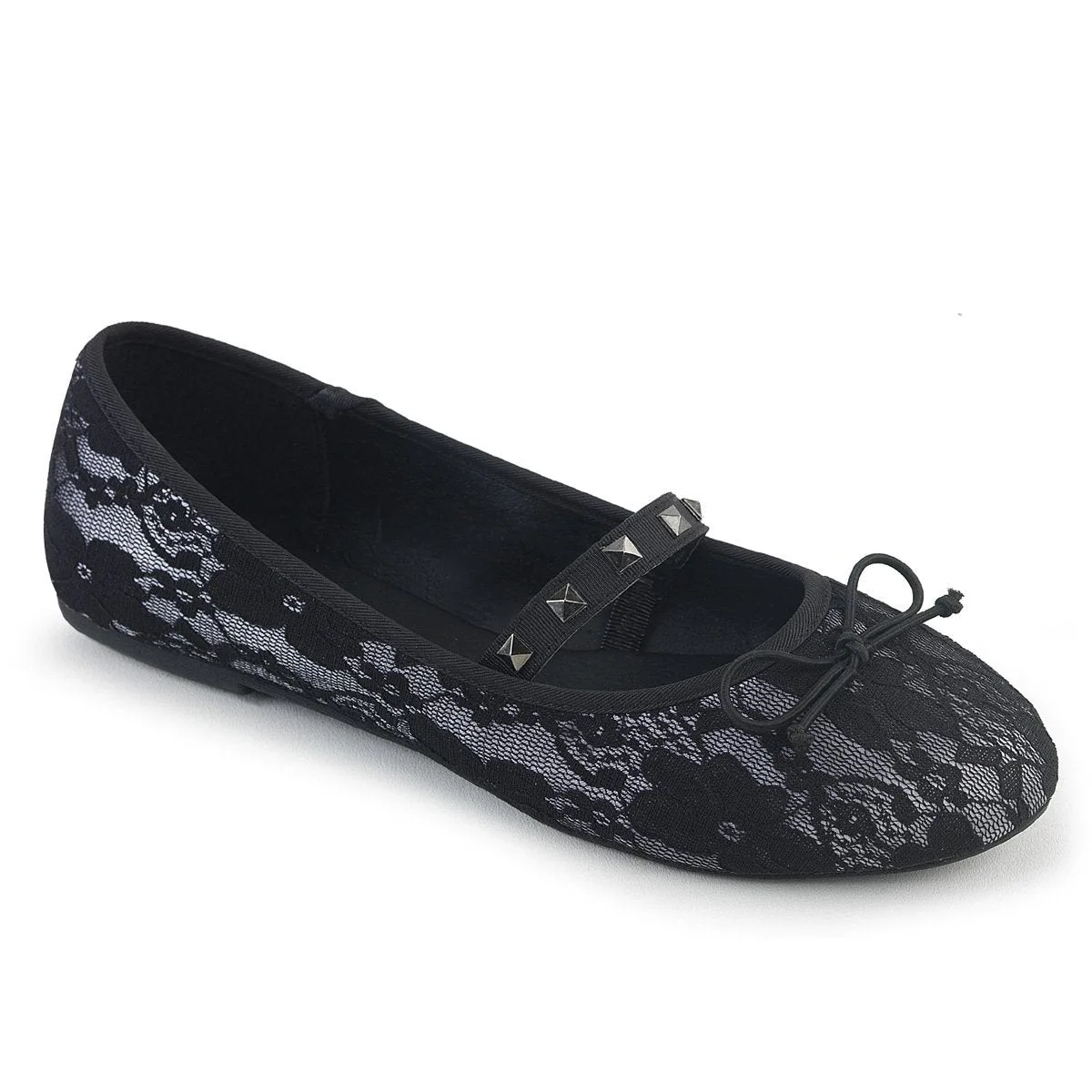 Entdecken Sie unsere Gotische Ballerina Blumen, ein unverzichtbares Stück für alle, die den gotischen Stil lieben und gleichzeitig auf Komfort Wert legen. Diese eleganten Ballerinas aus weißem Satin mit schwarzer Spitzenauflage, einer runden Zehenpartie, Nieten am Riemen und einer charmanten Schleife an der Spitze bringen einen Hauch von Romantik und Raffinesse in jedes Outfit. Perfekt für Damen, die nach einer stilvollen und bequemen Alternative zu hohen Absätzen suchen.