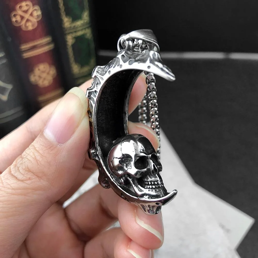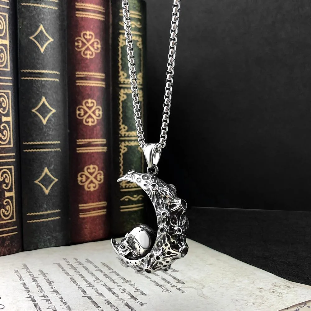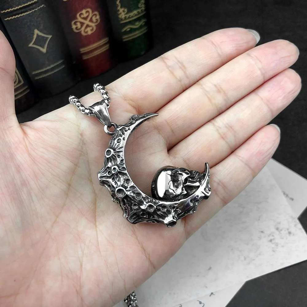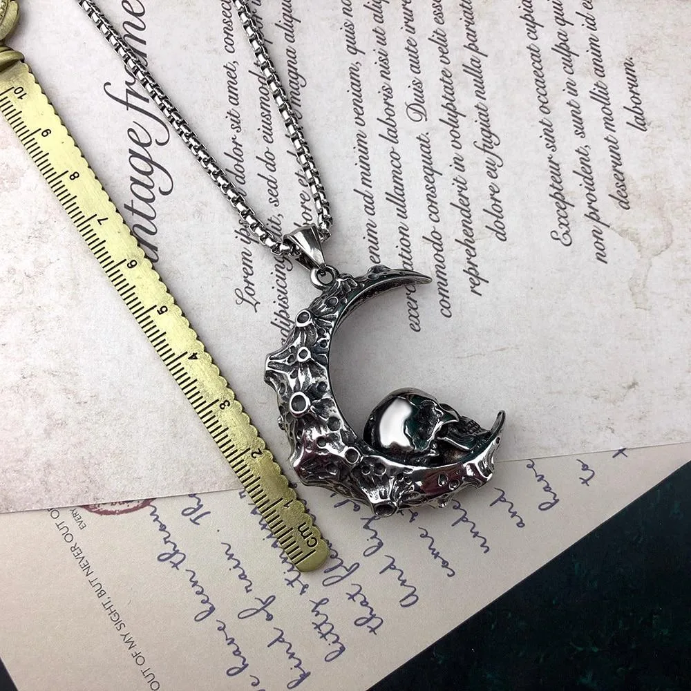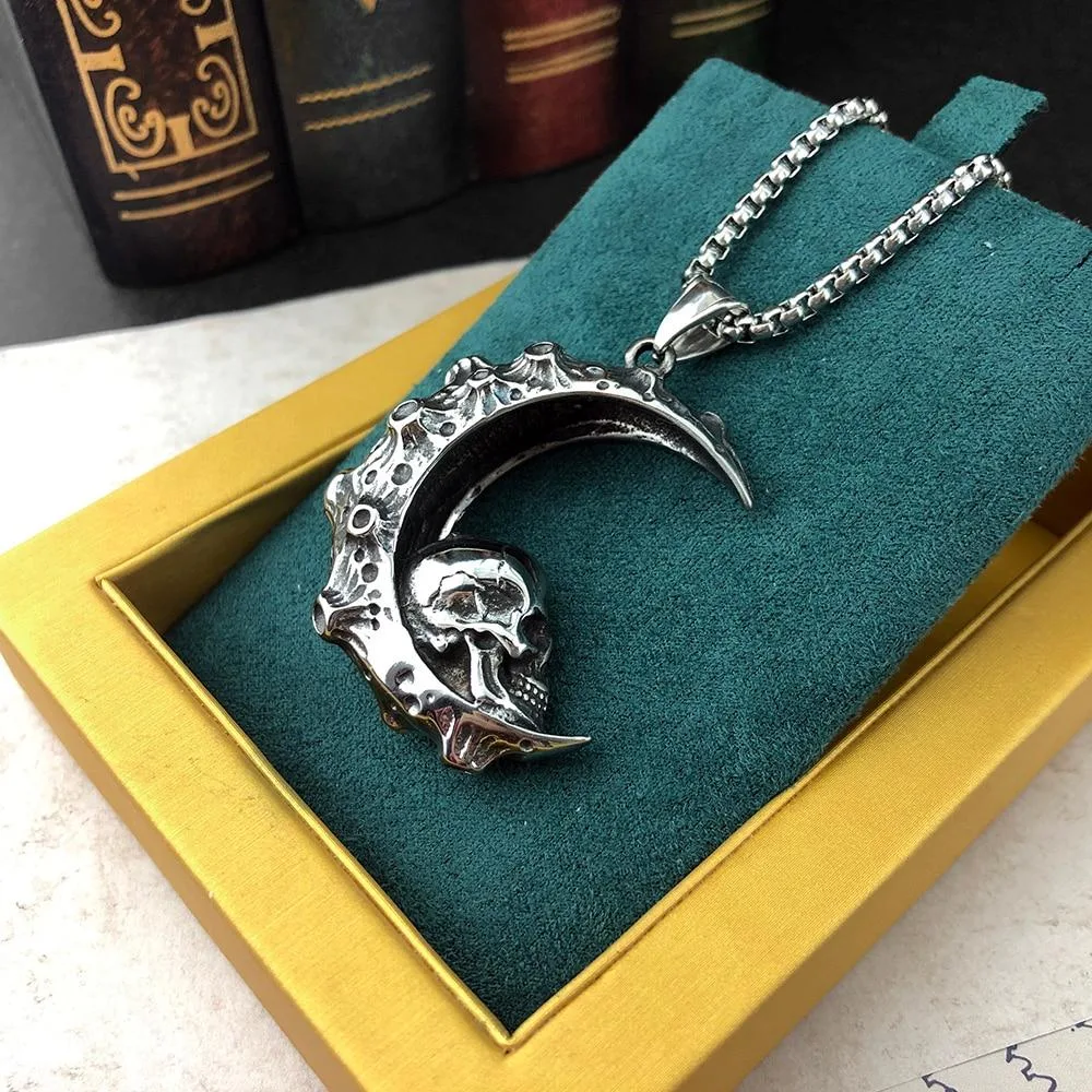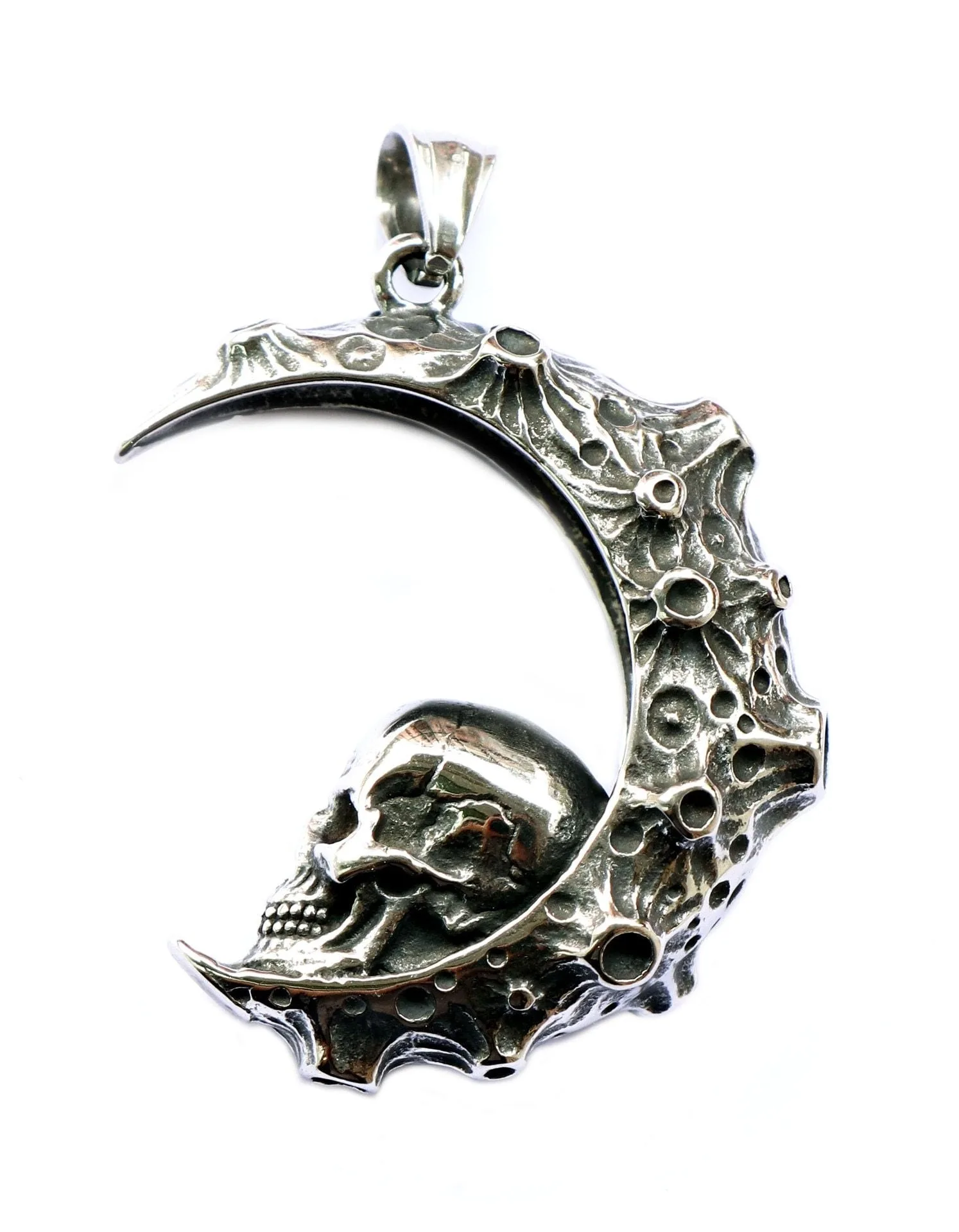 - Design: Halbmond-Anhänger mit Totenkopf-Motiv