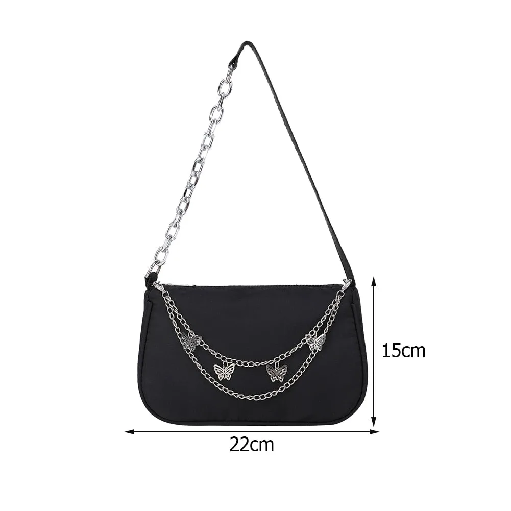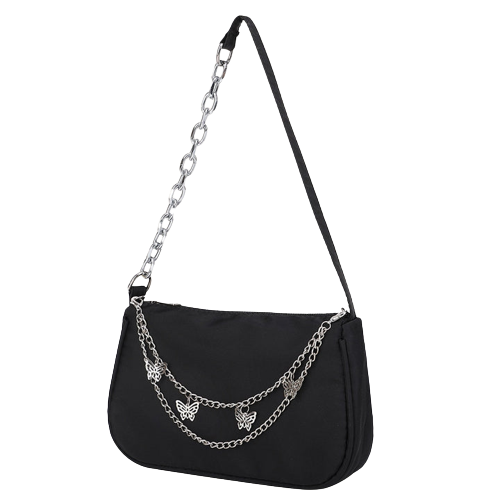 - Außergewöhnliches Design: Die Tasche ist mit einer abnehmbaren Kette mit Schmetterlingsverzierung und einem halben Kettengriff ausgestattet – perfekt für einen dramatischen Auftritt.